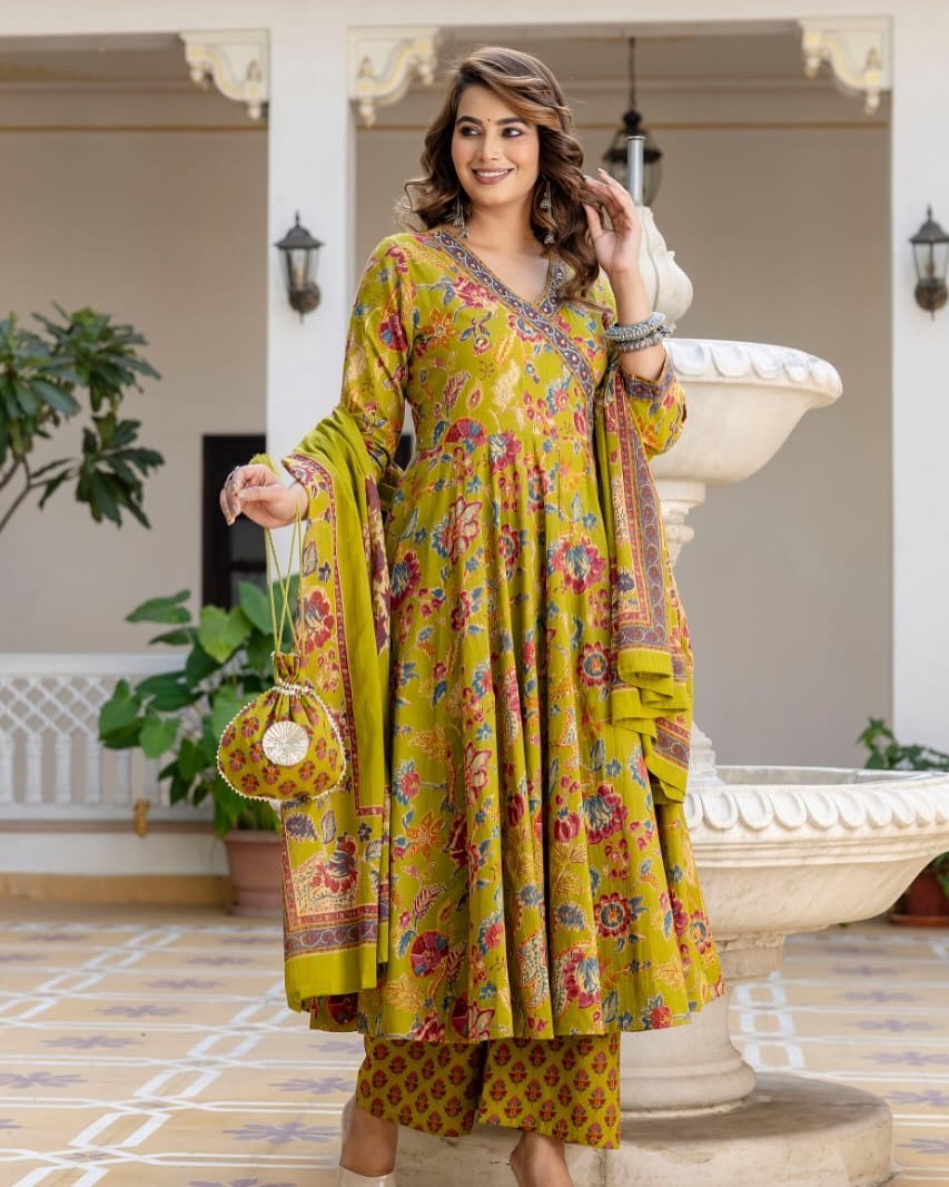 Elevate your ethnic style with this Printed Anarkali Flare Style Kurti Pant Dupatta Set, crafted from soft, breathable cotton. The elegant Anarkali kurti features beautiful prints, paired with comfortable pants and a matching dupatta for a complete look. Perfect for casual wear, festive gatherings, or daily elegance, this cotton salwar kameez suit offers both comfort and charm. Shop this timeless outfit online and embrace effortless traditional style.