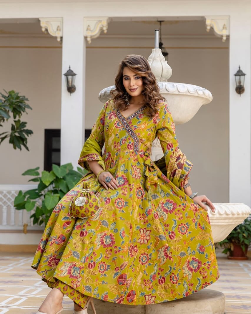 Green Color Floral Printed Angrakha Style Anarkali Flare Kurti Pant Dupatta Set Cotton Salwar Kameez Suit Online for Women - Set of 3