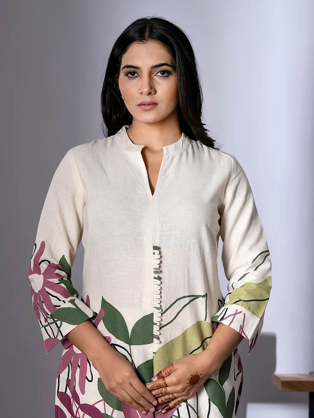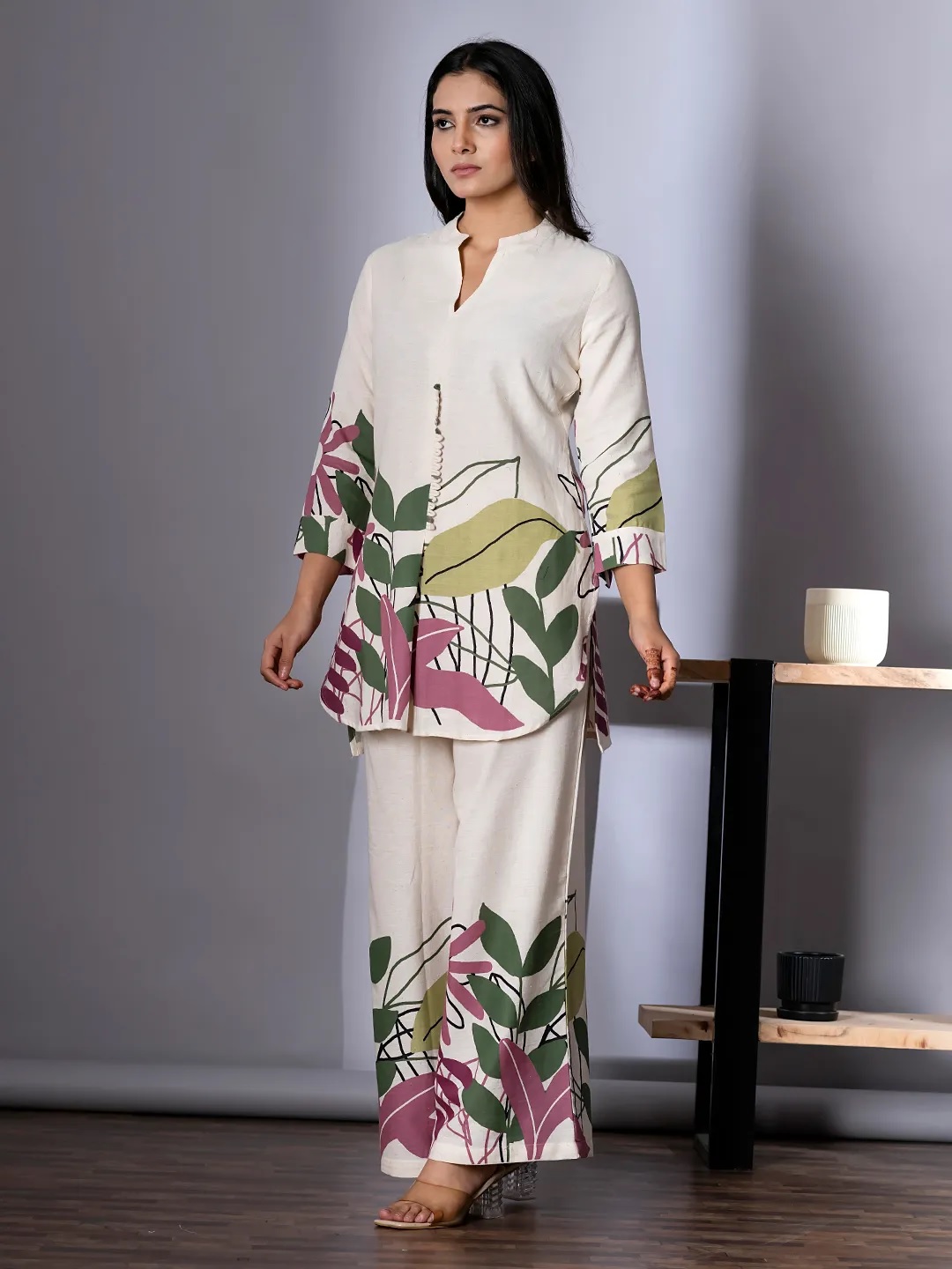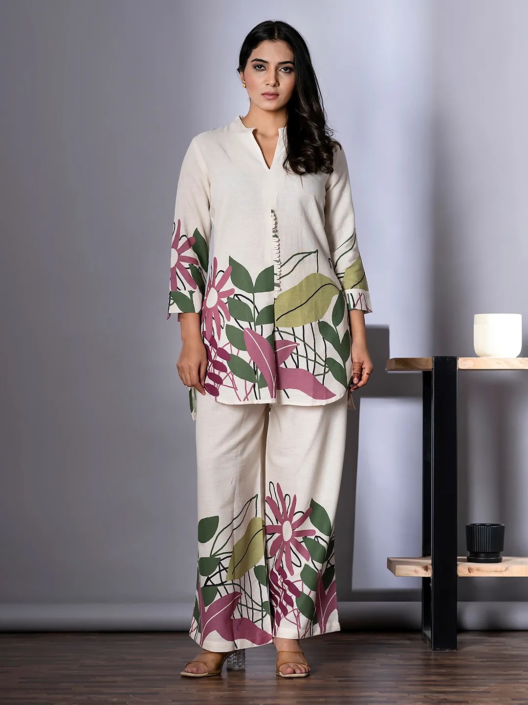 Off White Cotton Printed Kurti Palazzo Pant Co Ord Set Pakistani Salwar Kameez Straight Fit Suit - Set of 2