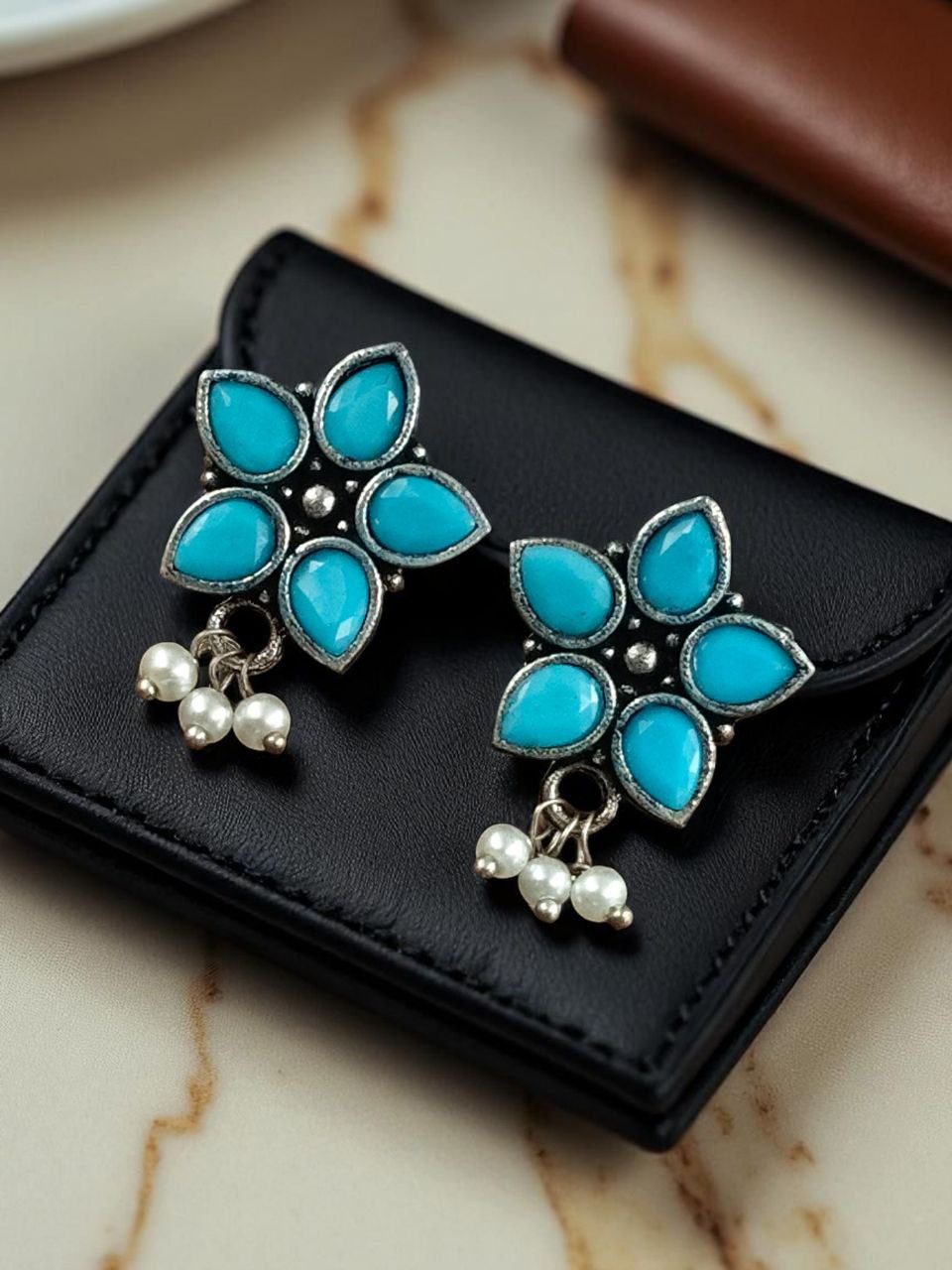 Aqua Dainty Stone Crafted Earring Ethnic Flower Designer Pearl Work Silver Oxidized Dailywear Tops Earrings