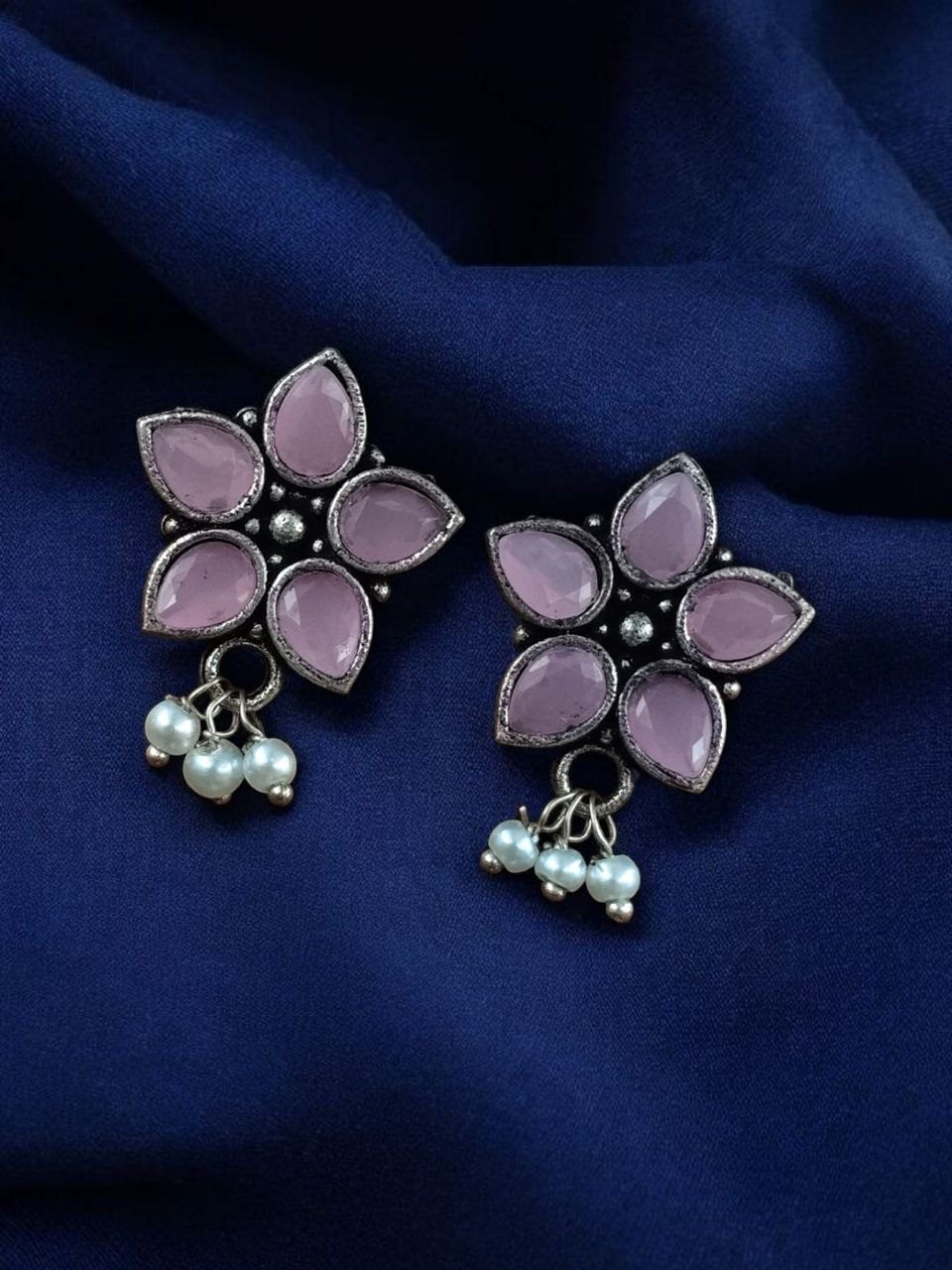 Baby Pink Dainty Stone Crafted Earring Ethnic Flower Designer Pearl Work Silver Oxidized Dailywear Tops Earrings