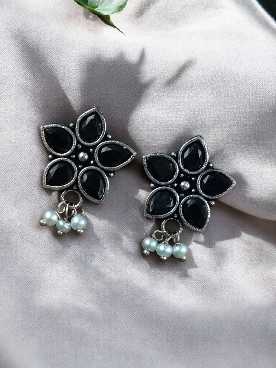 Black Dainty Stone Crafted Earring Ethnic Flower Designer Pearl Work Silver Oxidized Dailywear Tops Earrings