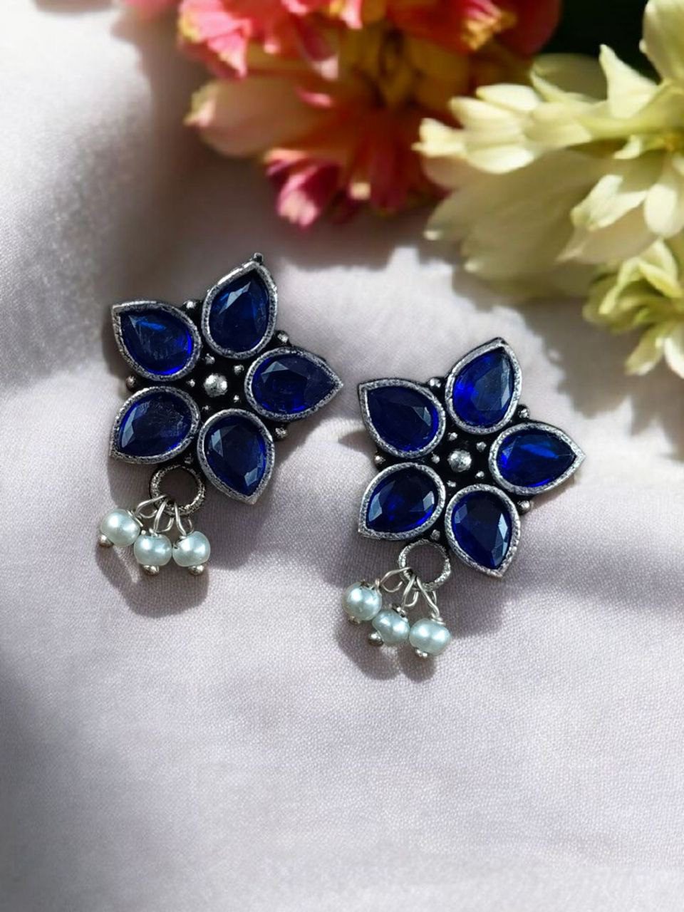 Blue Dainty Stone Crafted Earring Ethnic Flower Designer Pearl Work Silver Oxidized Dailywear Tops Earrings