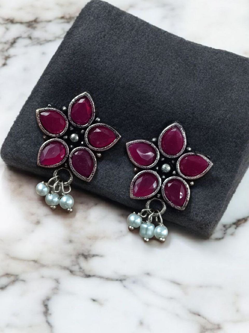 Red Dainty Stone Crafted Earring Ethnic Flower Designer Pearl Work Silver Oxidized Dailywear Tops Earrings