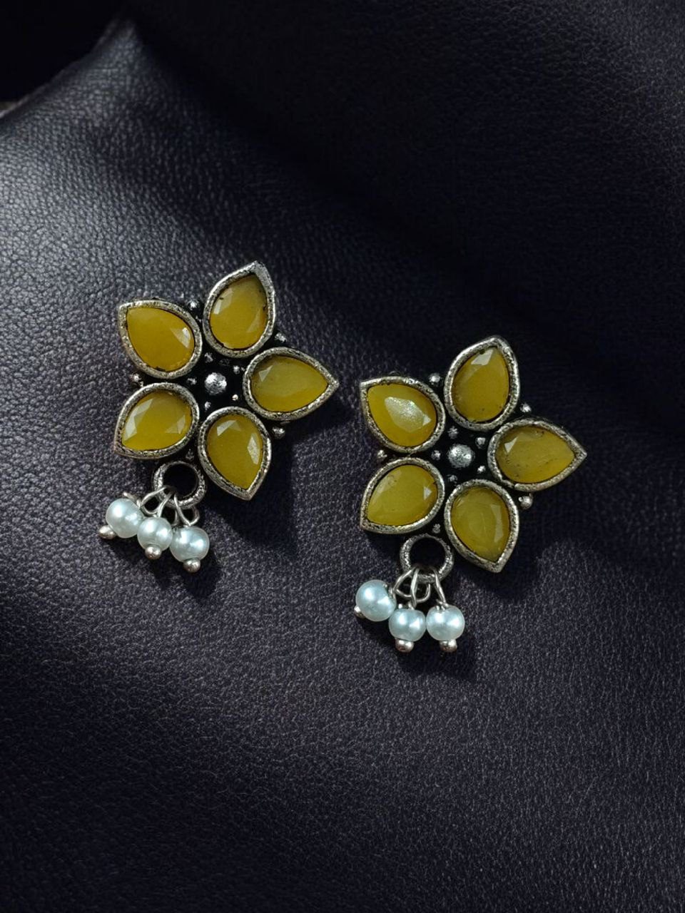 Yellow Dainty Stone Crafted Earring Ethnic Flower Designer Pearl Work Silver Oxidized Dailywear Tops Earrings