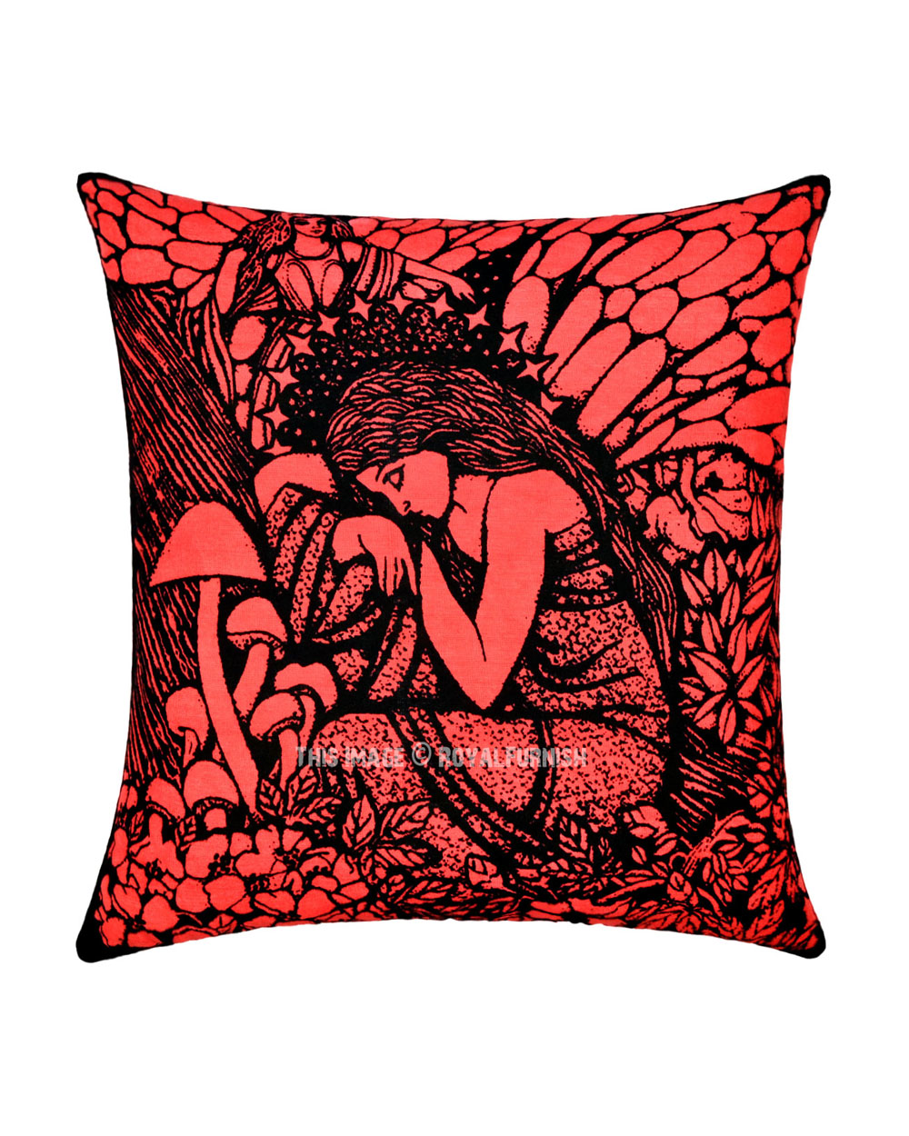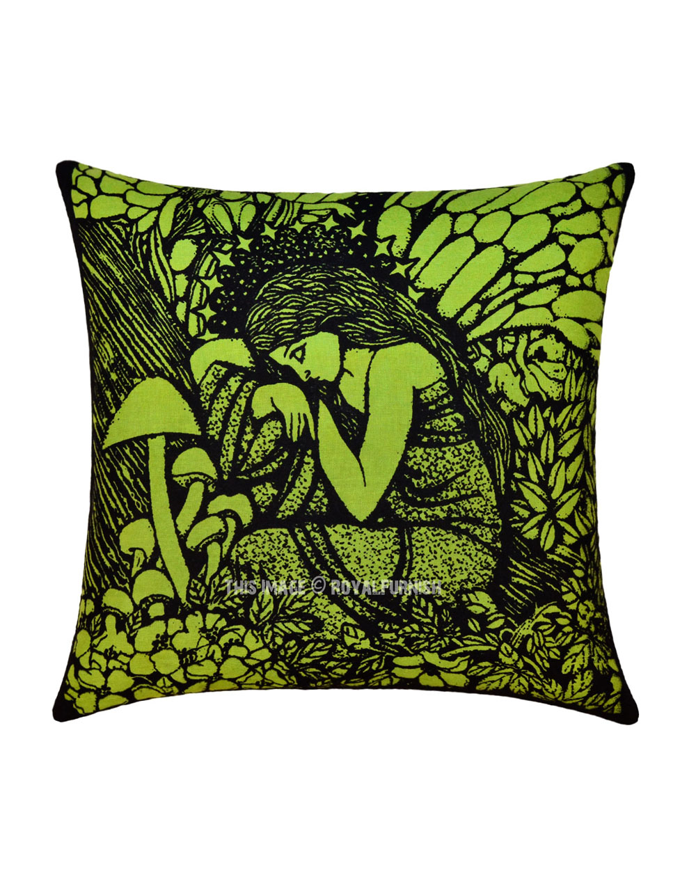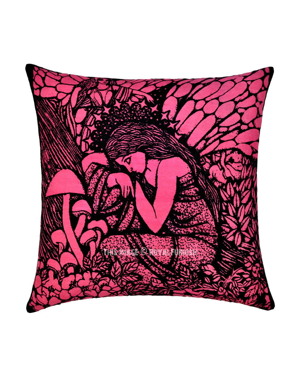 Handcrafted hippie tie dye throw pillow cover made from 100% cotton fabric, a stylish statement that will accent any room. Individually cut and sewn by hand, the pillow cover measures 16" x 16", features fairy queen and other side solid black color and is finished with a concealed zipper for ease of care.