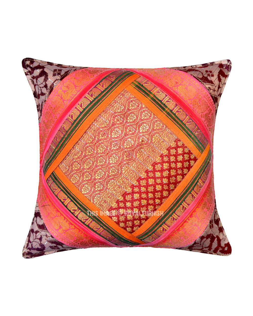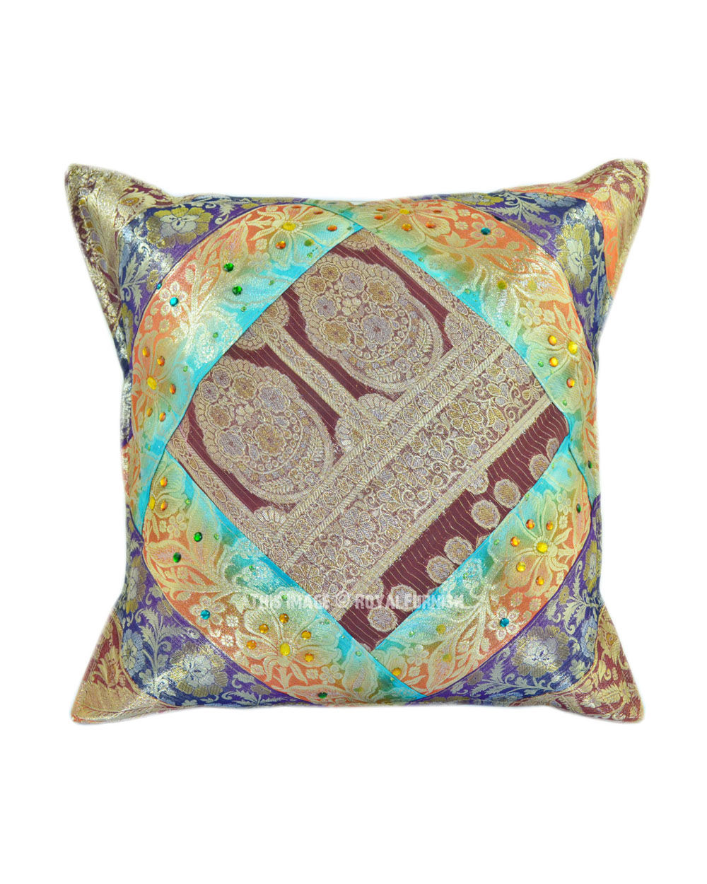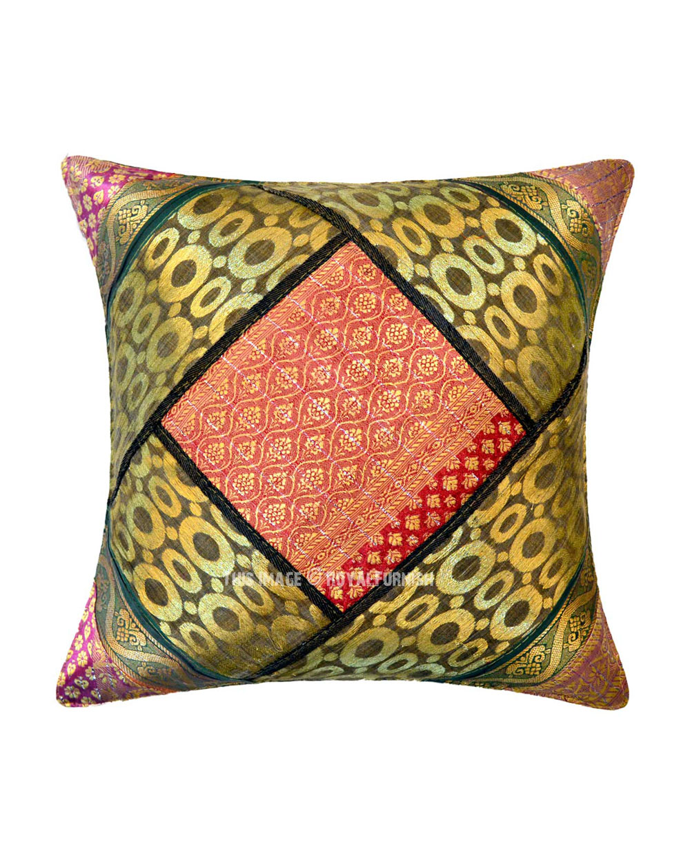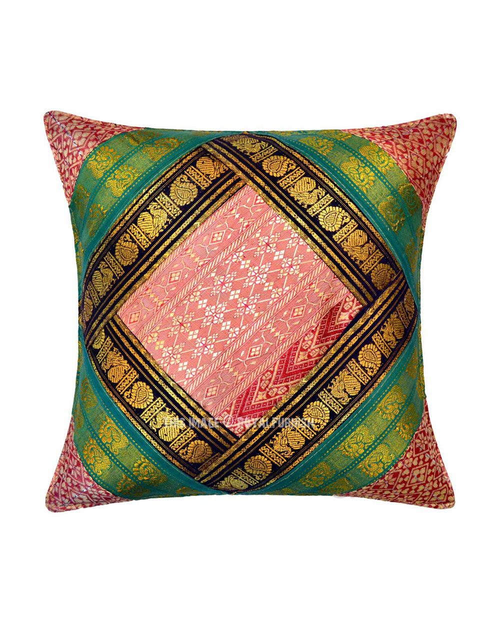 With its sleeky and shimmery surface and brocade pattern, Indian sari silk brocade pillow serves as a visual and textural expression of opulence and luxury at very cheap price. It is 100% made in India from beginning to end. The sophisticated square India silk brocade offer a perfect accent to your home furniture chair, sofa, bed. The Silk brocade pillow completes the warm look of the bedding.