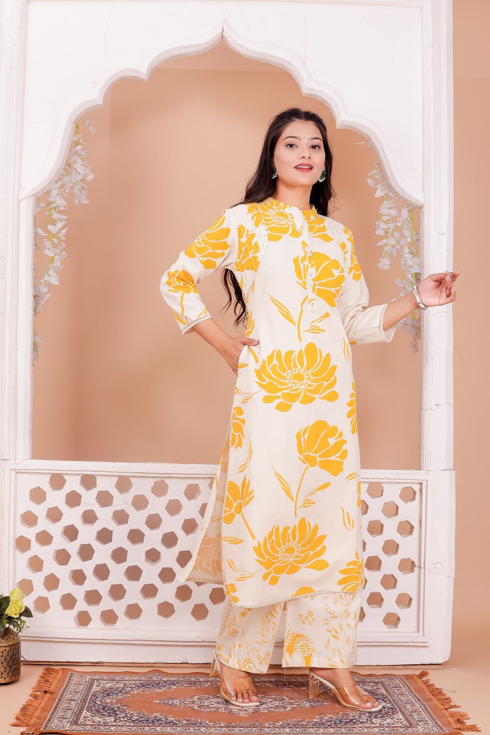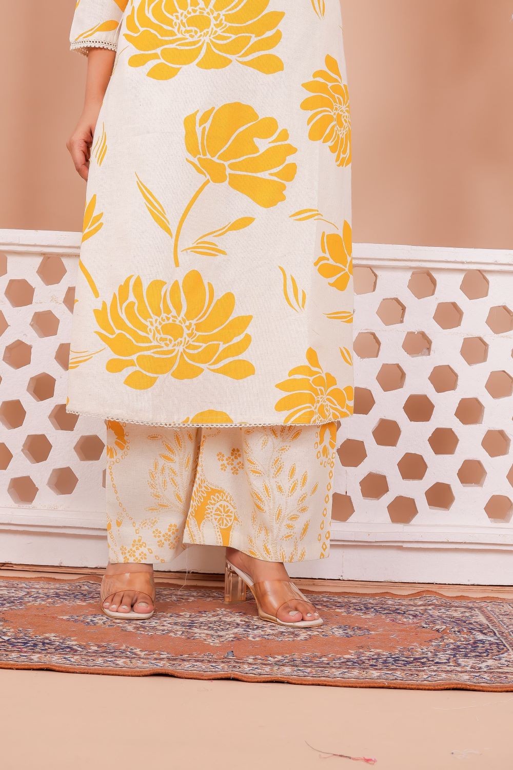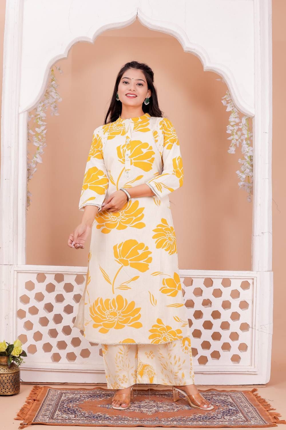 Yellow & White Floral Printed  A-Line Cotton Kurti Pant Co-Ord Set Salwar Kameez For Women - Set Of 2