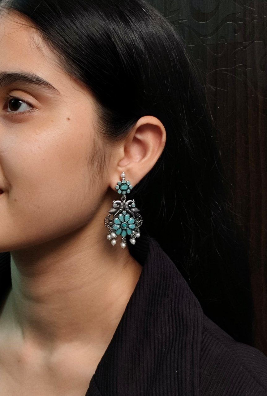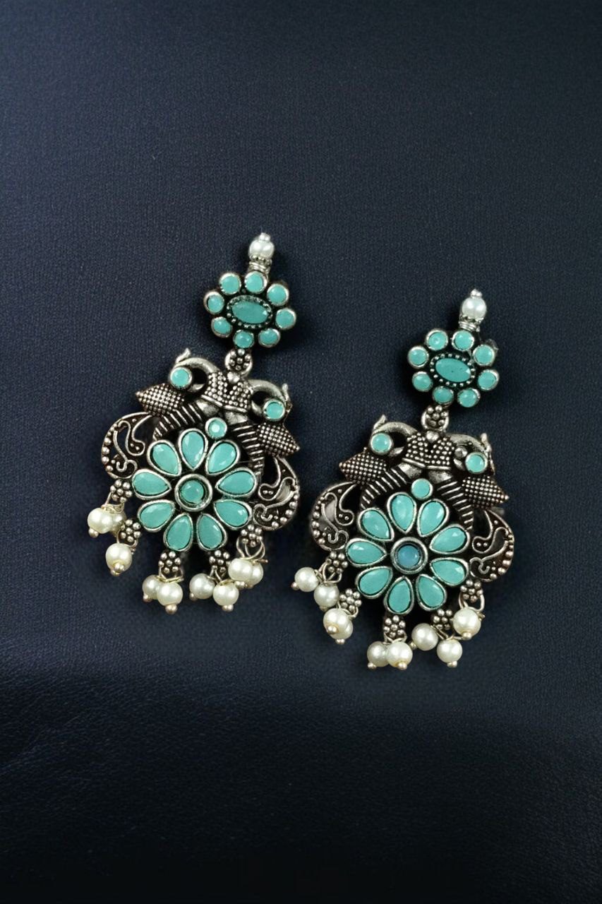 Mint Traditional Indian Peacock Silver Plated Dangler Earring Stonework Affordable Boho Jewellery Earring