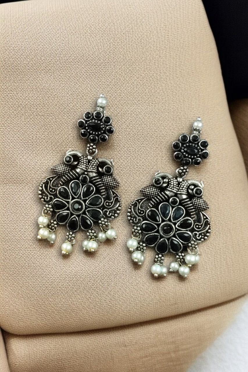 Black Traditional Indian Peacock Silver Plated Dangler Earring Stonework Affordable Boho Jewellery Earring