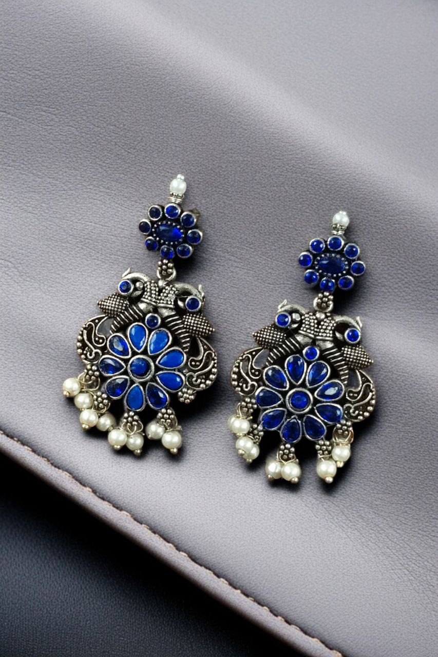 Blue Traditional Indian Peacock Silver Plated Dangler Earring Stonework Affordable Boho Jewellery Earring