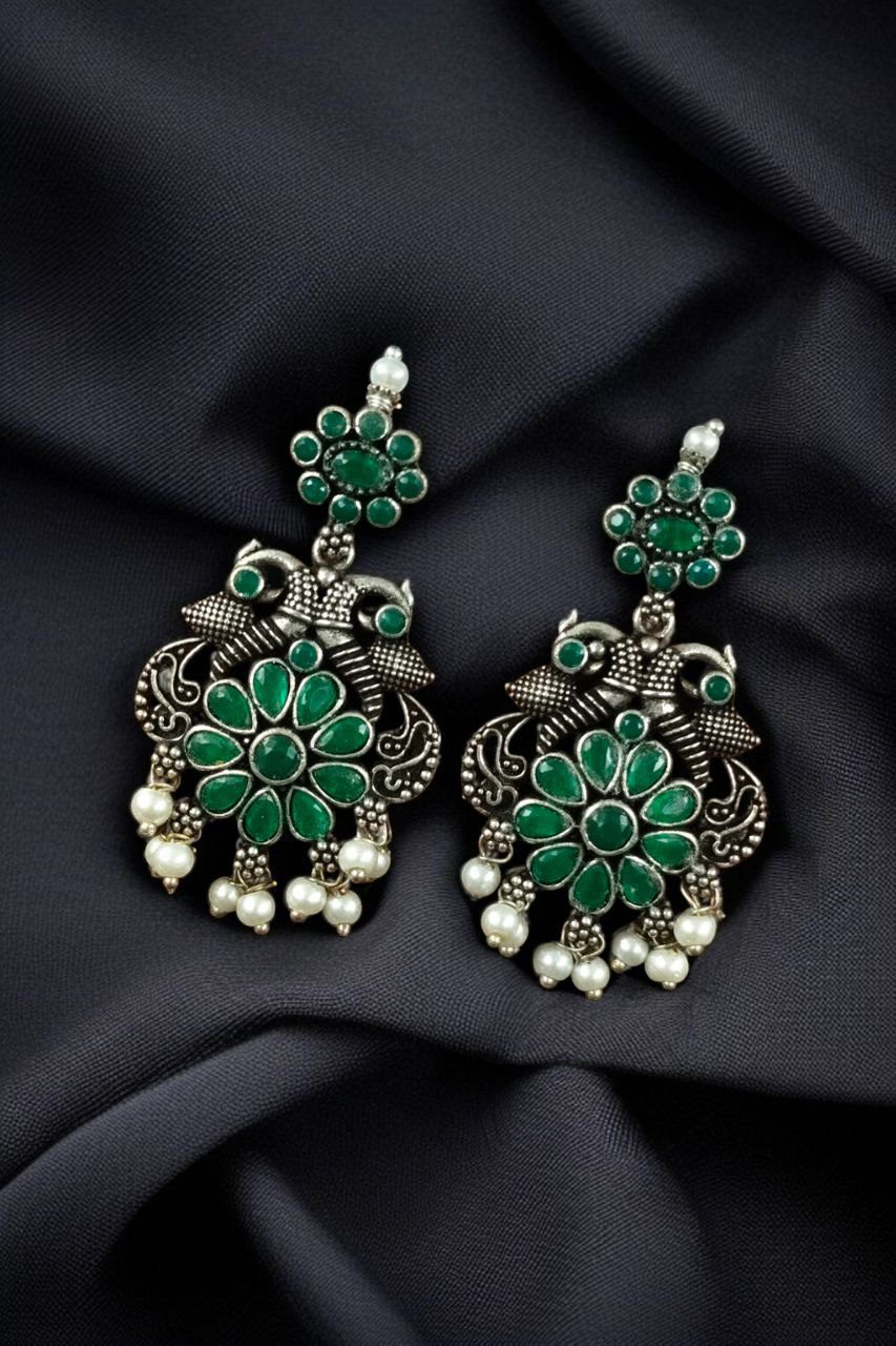 Green Traditional Indian Peacock Silver Plated Dangler Earring Stonework Affordable Boho Jewellery Earring