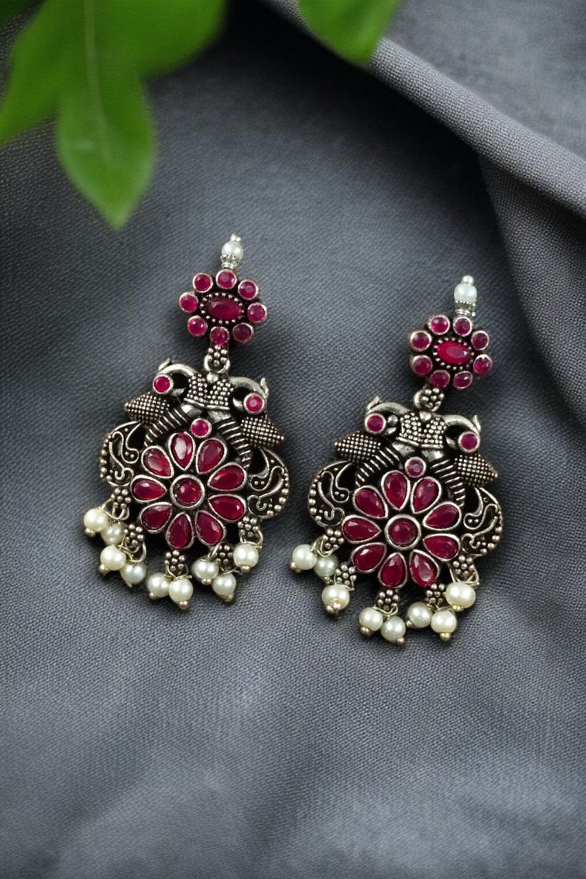 Red Traditional Indian Peacock Silver Plated Dangler Earring Stonework Affordable Boho Jewellery Earring