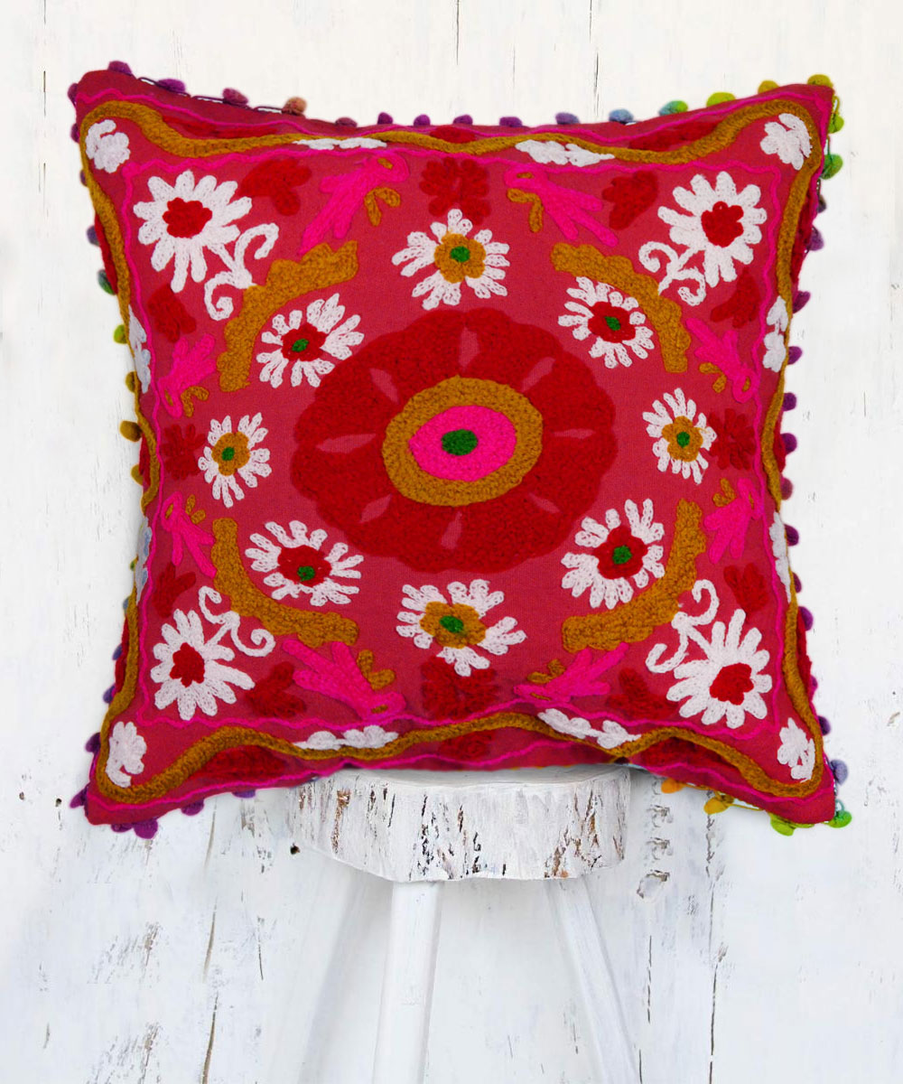 Allow your room to turn into a beautiful, extravagant space of the castle with the elegant and stylish Suzani pillow cover with round circle motifs. It is intricate thread work and famous art which can easily mix matched with much living room furniture. Raised thread embroidery is soft to the skin and elegant to the viewer. Dense embroidery looks conventional with innovative pattern of suzani designs. It is attractive minimalist design manages to catch the eye on the onlooker and demands attention.