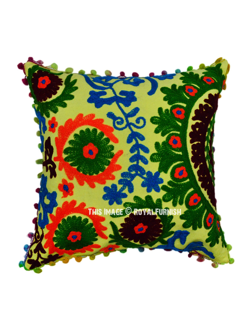 Design 4 16" Bohemian Multi Colorful Suzani Handmade Embroidered Square Decorative Throw Pillow Cover