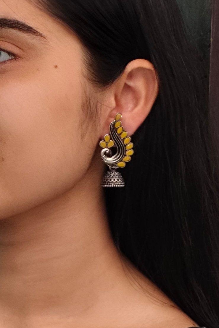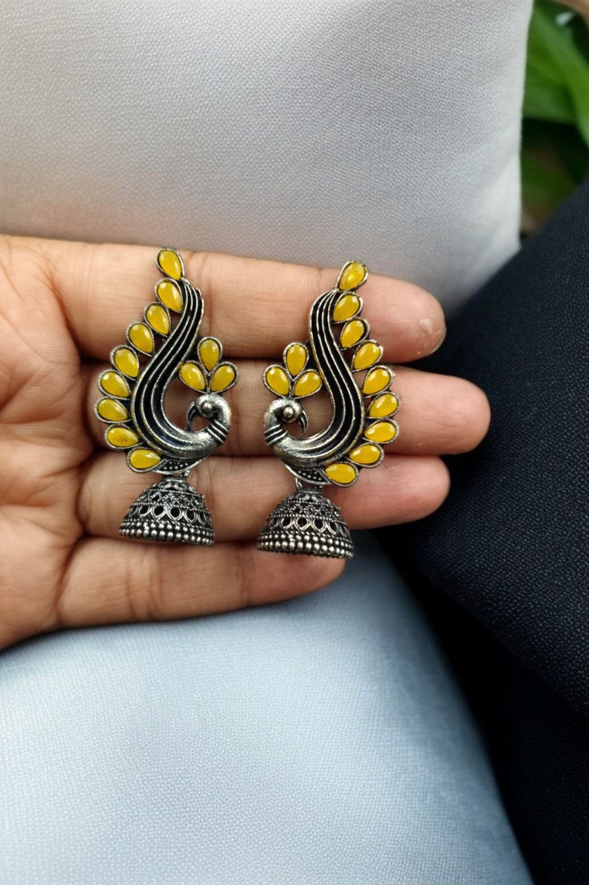 Yellow Indian Classic Peacock Jhumki Handcrafted Stonework Silver Plated Oxidized Dangler Earring for Girls