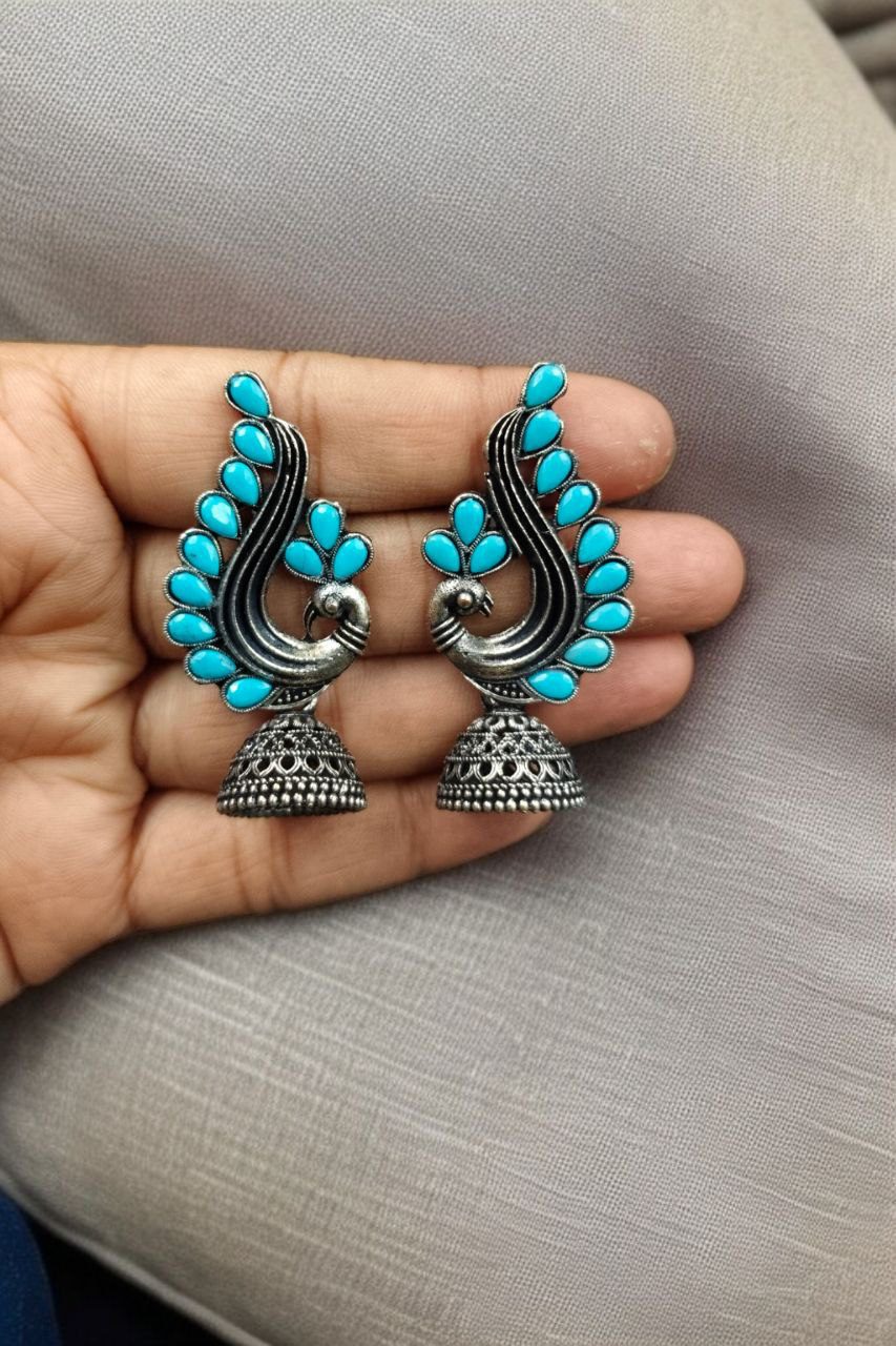 Aqua Indian Classic Peacock Jhumki Handcrafted Stonework Silver Plated Oxidized Dangler Earring for Girls