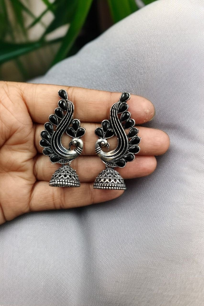 Black Indian Classic Peacock Jhumki Handcrafted Stonework Silver Plated Oxidized Dangler Earring for Girls