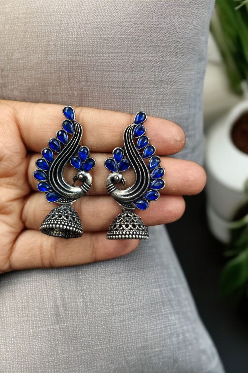 Blue Indian Classic Peacock Jhumki Handcrafted Stonework Silver Plated Oxidized Dangler Earring for Girls
