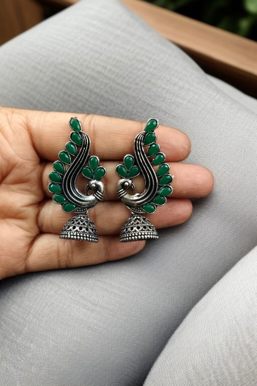 Green Indian Classic Peacock Jhumki Handcrafted Stonework Silver Plated Oxidized Dangler Earring for Girls