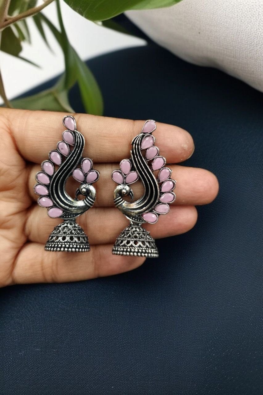 Baby Pink Indian Classic Peacock Jhumki Handcrafted Stonework Silver Plated Oxidized Dangler Earring for Girls