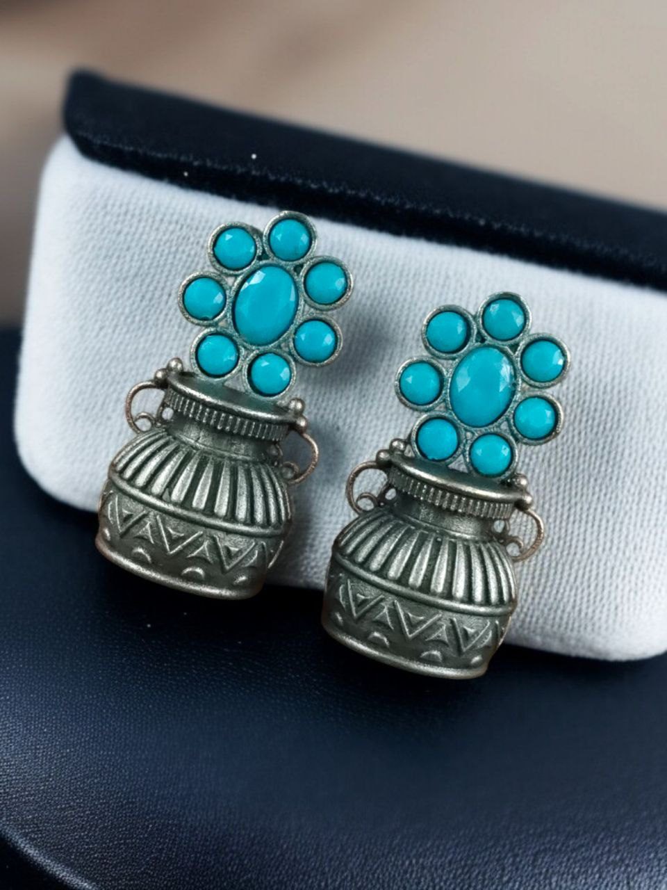 Aqua Unique Ethnic Stonework Kalash Stud Rustic Silver Oxidised Earring Boho Jewellery Earring for Girls