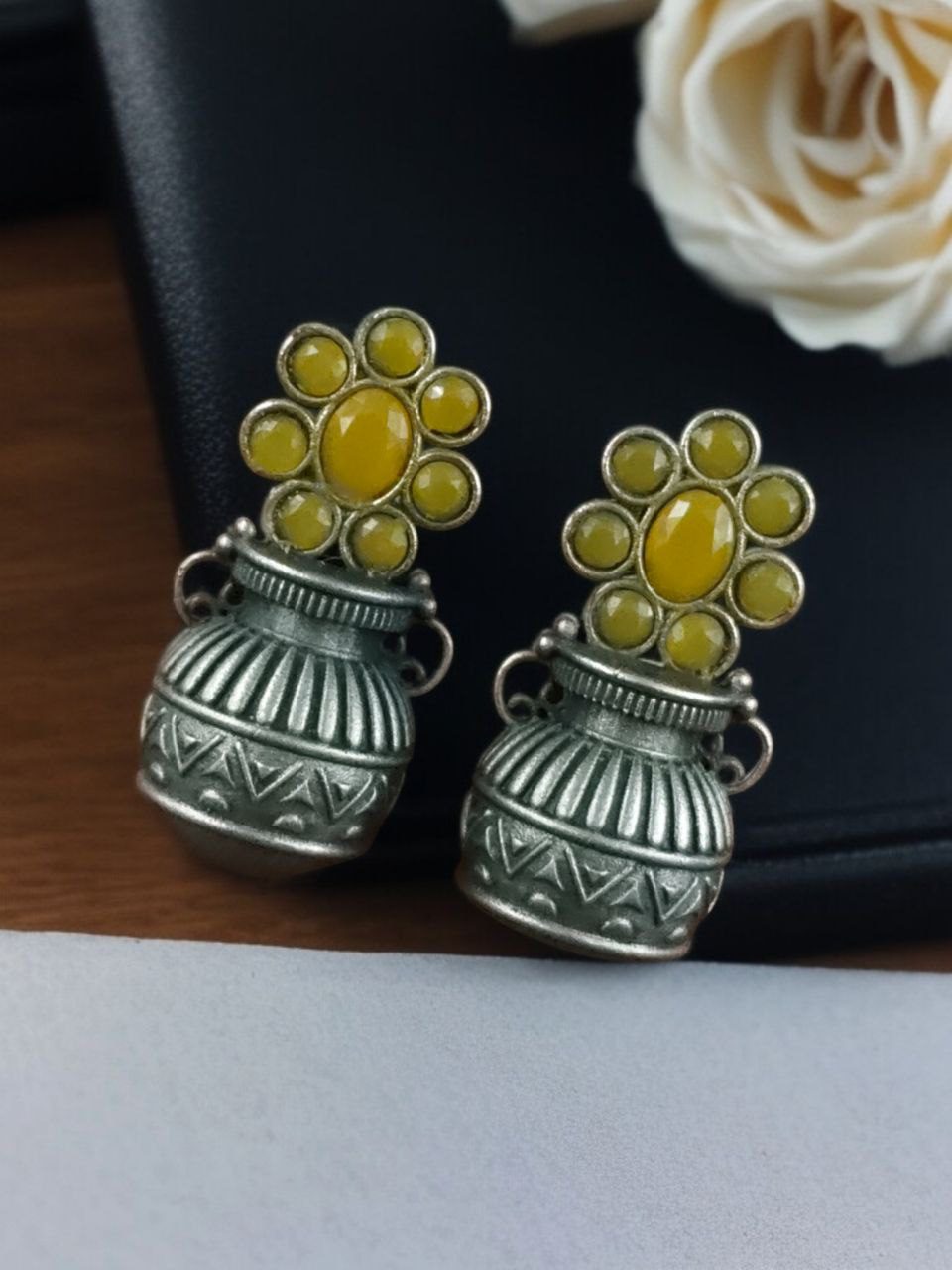 Yellow Unique Ethnic Stonework Kalash Stud Rustic Silver Oxidised Earring Boho Jewellery Earring for Girls