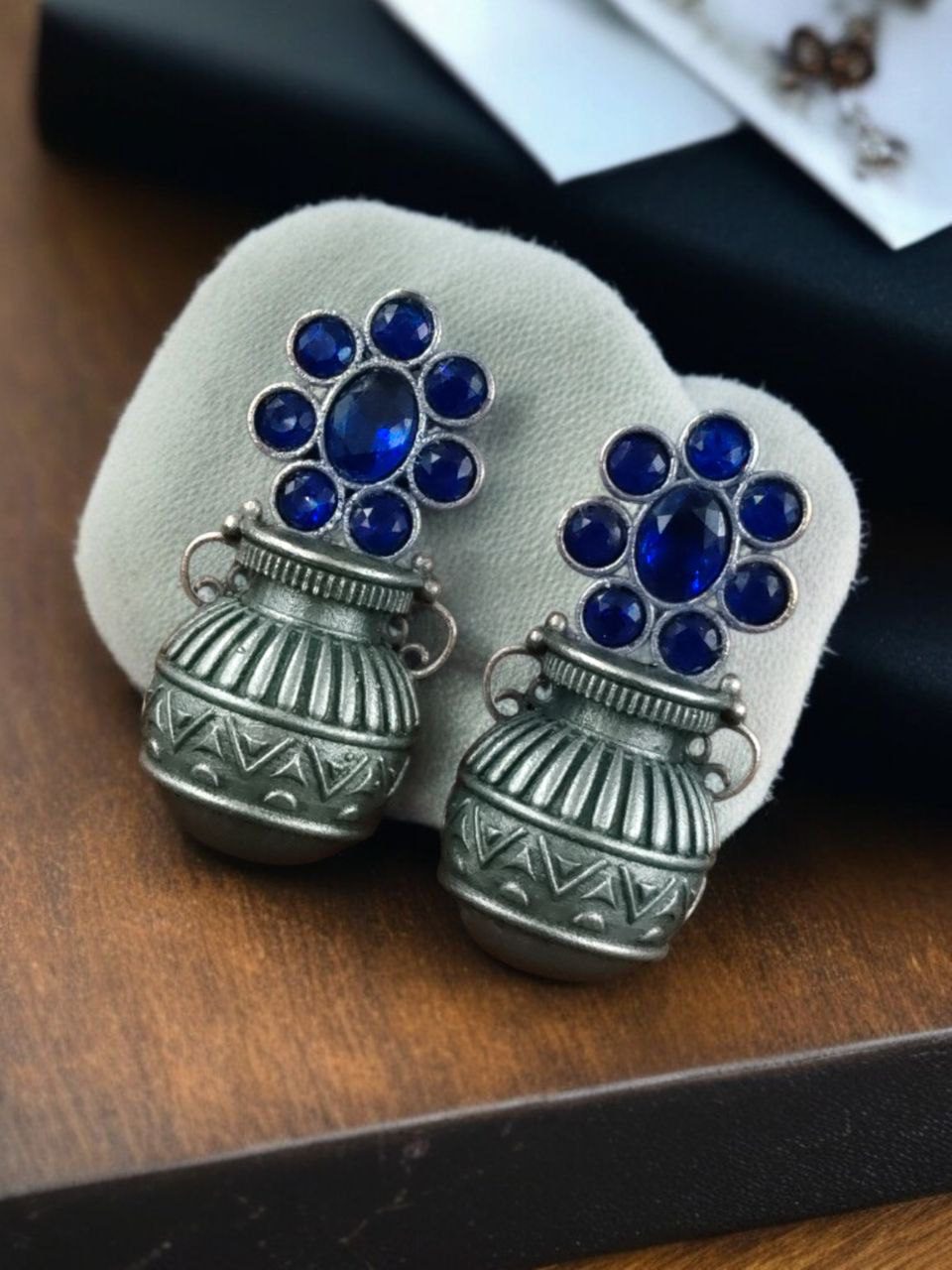 Blue Unique Ethnic Stonework Kalash Stud Rustic Silver Oxidised Earring Boho Jewellery Earring for Girls