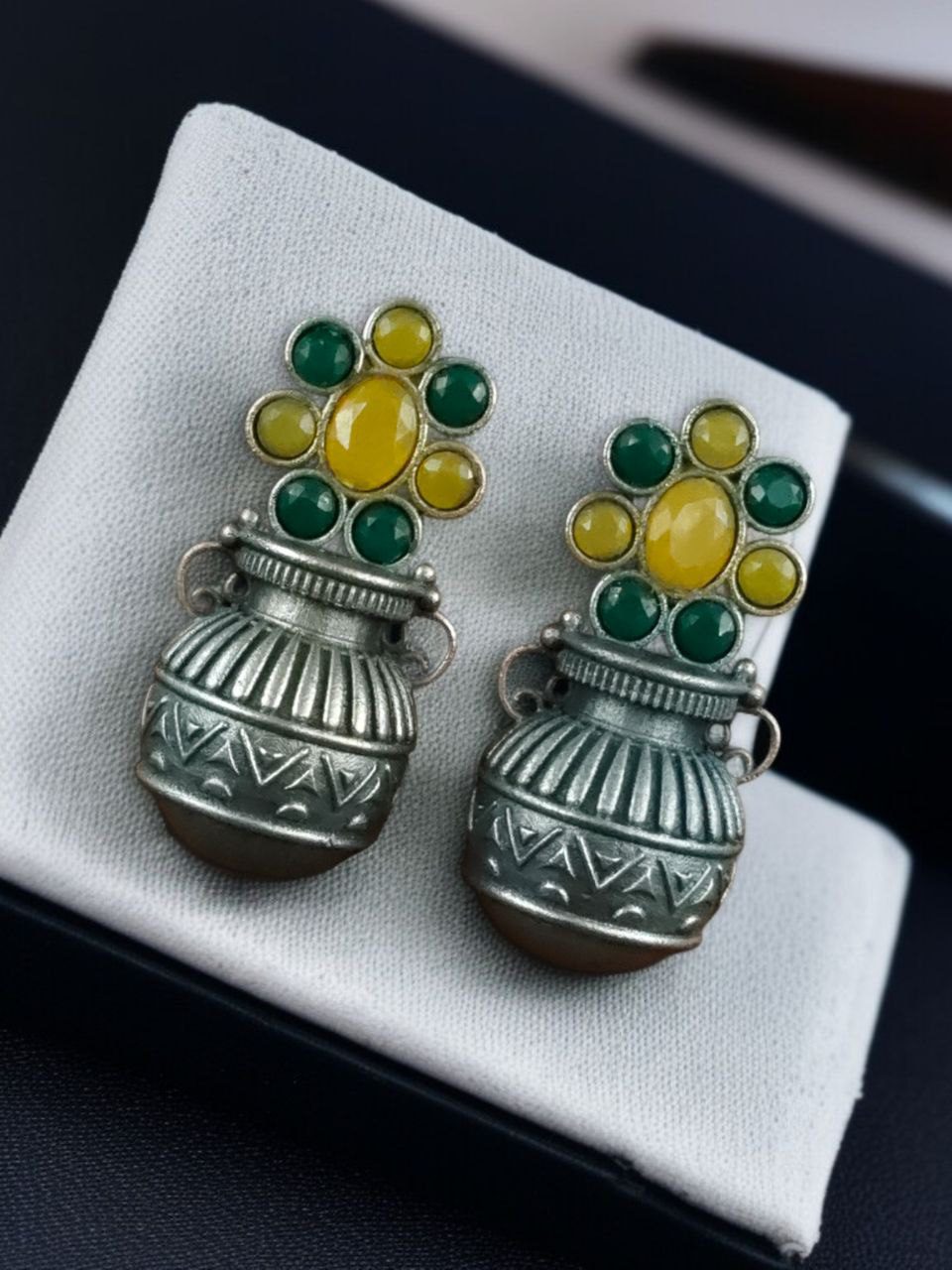 GreenYellow Unique Ethnic Stonework Kalash Stud Rustic Silver Oxidised Earring Boho Jewellery Earring for Girls