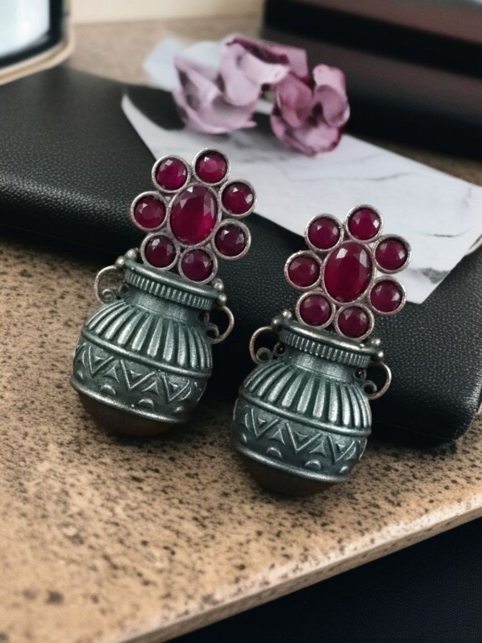 Red Unique Ethnic Stonework Kalash Stud Rustic Silver Oxidised Earring Boho Jewellery Earring for Girls