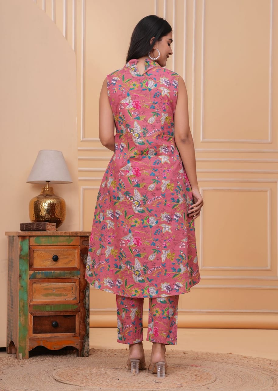 Pink Floral Printed Cotton Kurti Pant Co Ord Set Sleeveless Salwar Kameez For Women - Set Of 2