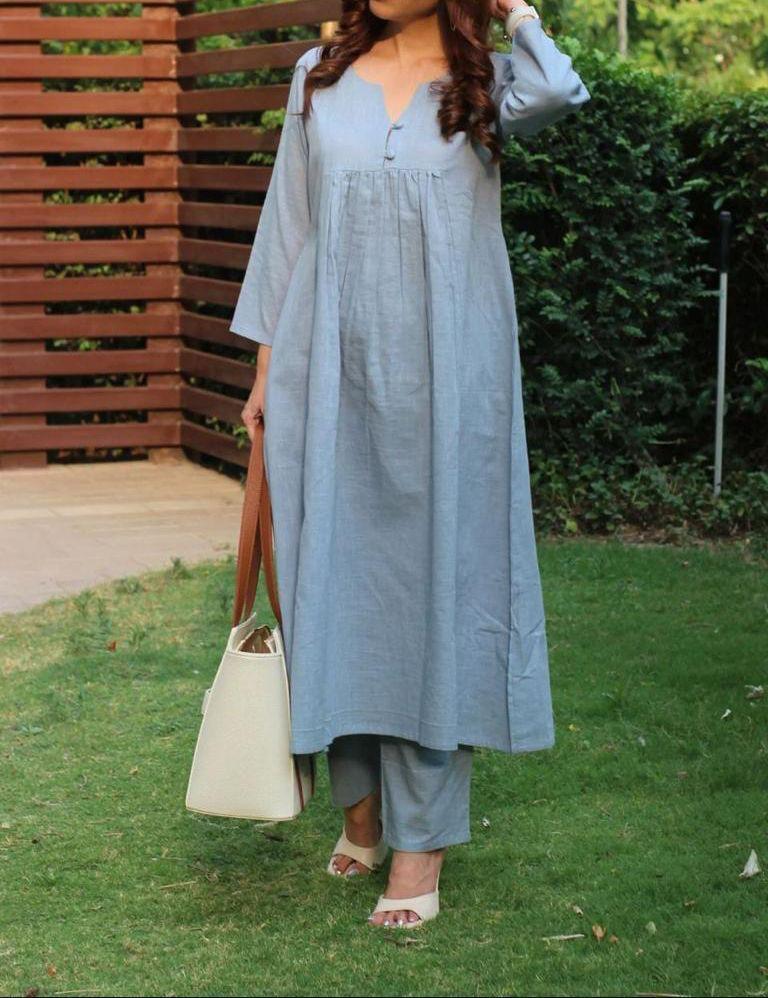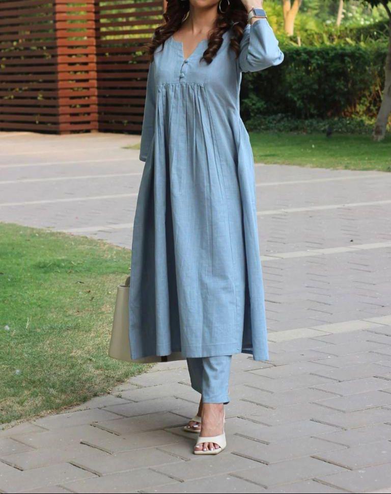 Blue Beautiful Cotton Slub Pleated A-Line Cotton Kurti Pant Co Ord Set for Women (Set of 2)