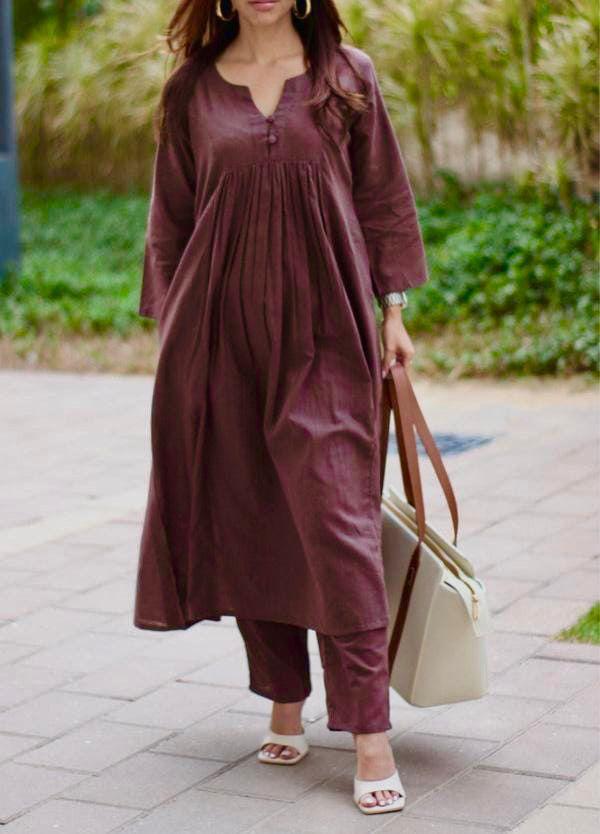 Brown Beautiful Khadi Cotton Slub Pleated A-Line Cotton Kurti Pant Co Ord Set for Women (Set of 2)