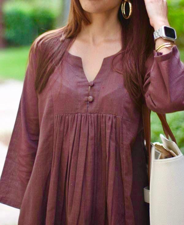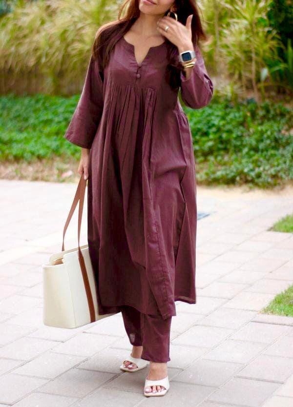 • Maroon Beautiful Khadi Cotton Slub Pleated A-Line Cotton Kurti Pant Co Ord Set for Women (Set of 2)