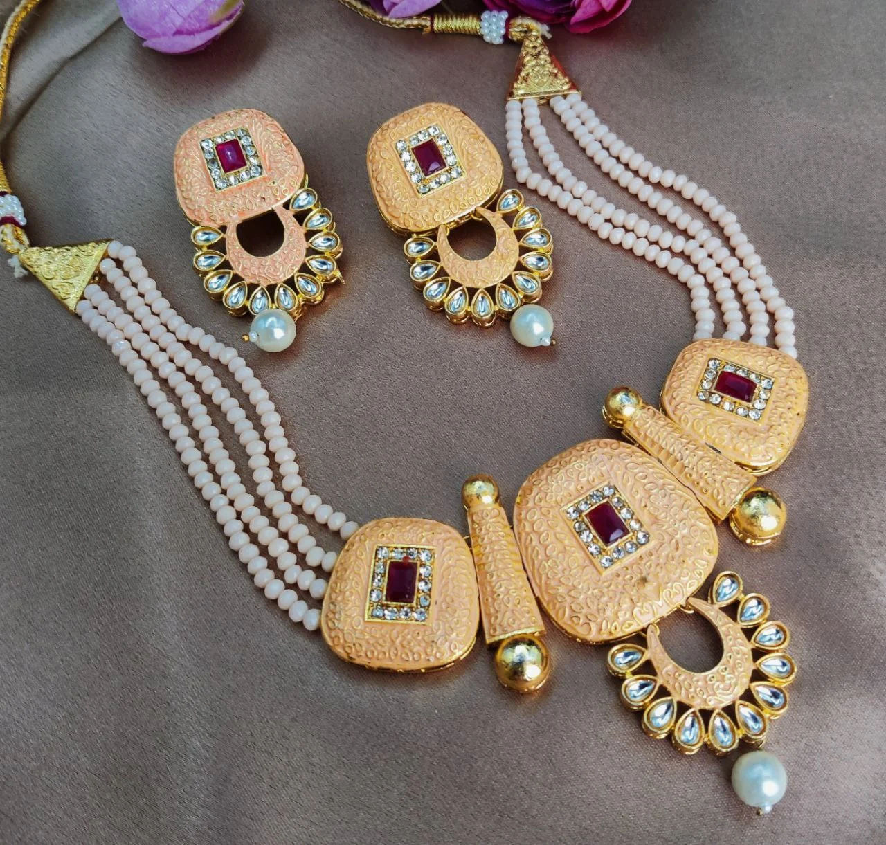 Pink Indian Pakistani Women Oxidized Kundan Beaded Choker Meena Necklace Earring Set