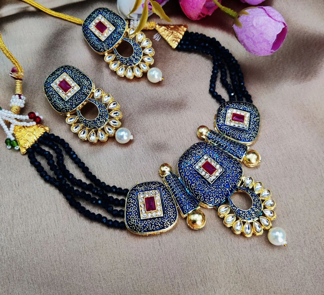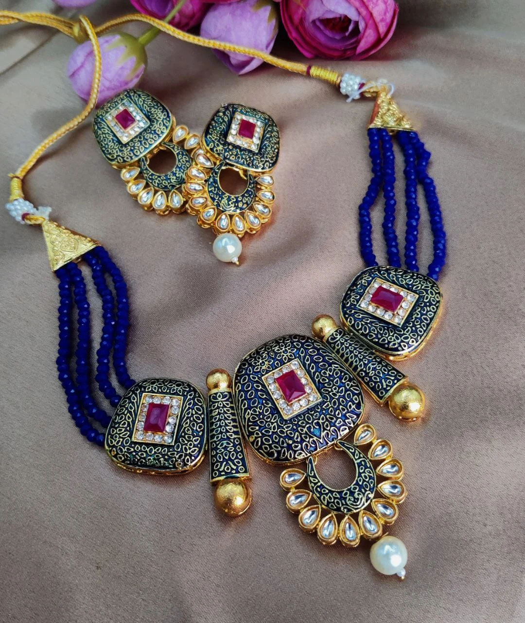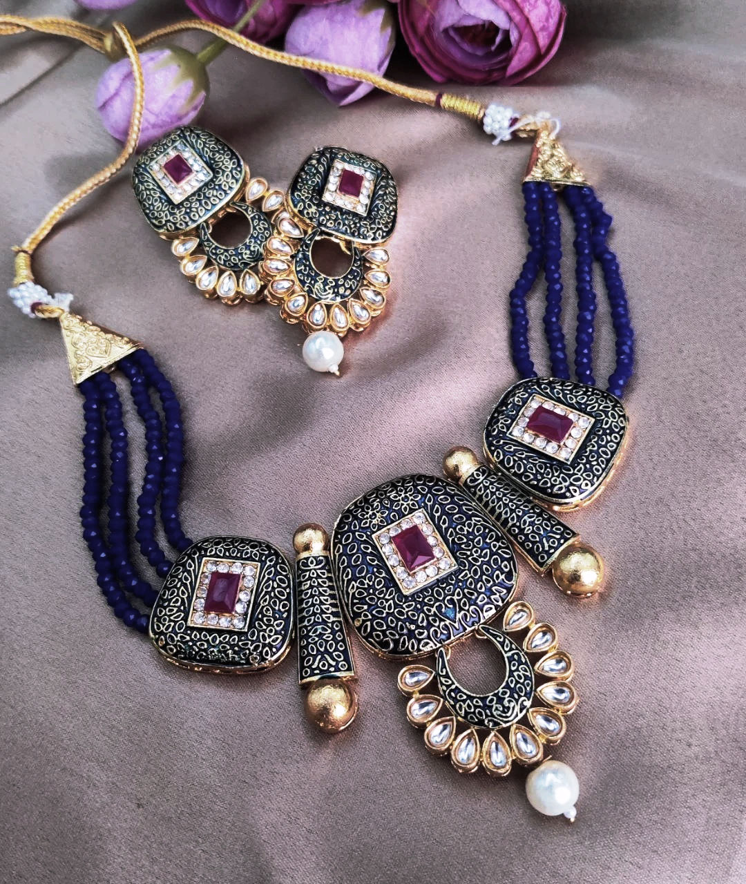 Dark Blue Indian Pakistani Women Oxidized Kundan Beaded Choker Meena Necklace Earring Set