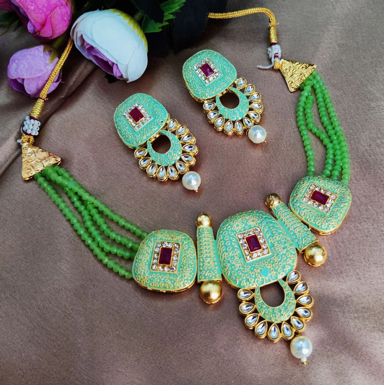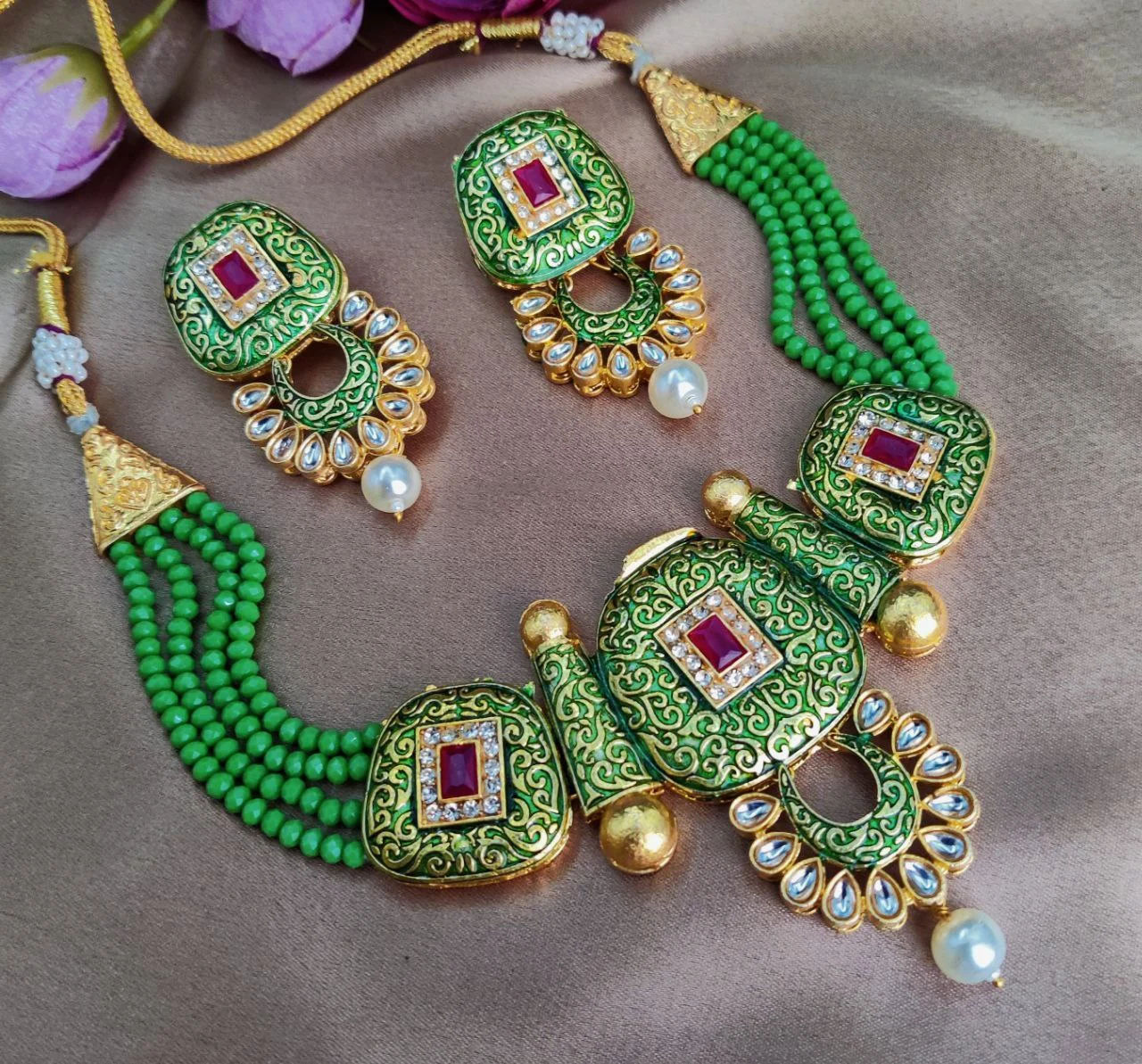 Dark Green Indian Pakistani Women Oxidized Kundan Beaded Choker Meena Necklace Earring Set