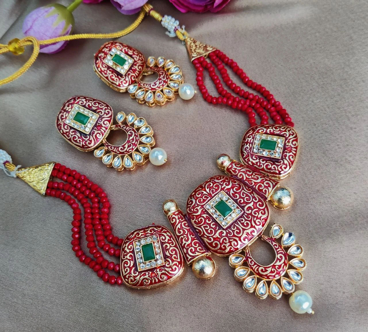 Red Indian Pakistani Women Oxidized Kundan Beaded Choker Meena Necklace Earring Set