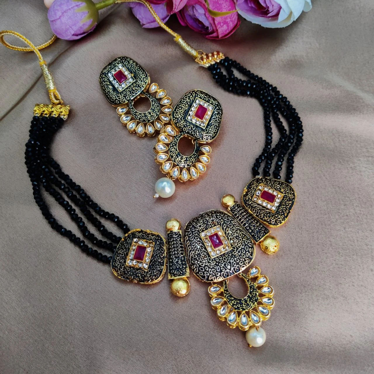 Black Indian Pakistani Women Oxidized Kundan Beaded Choker Meena Necklace Earring Set