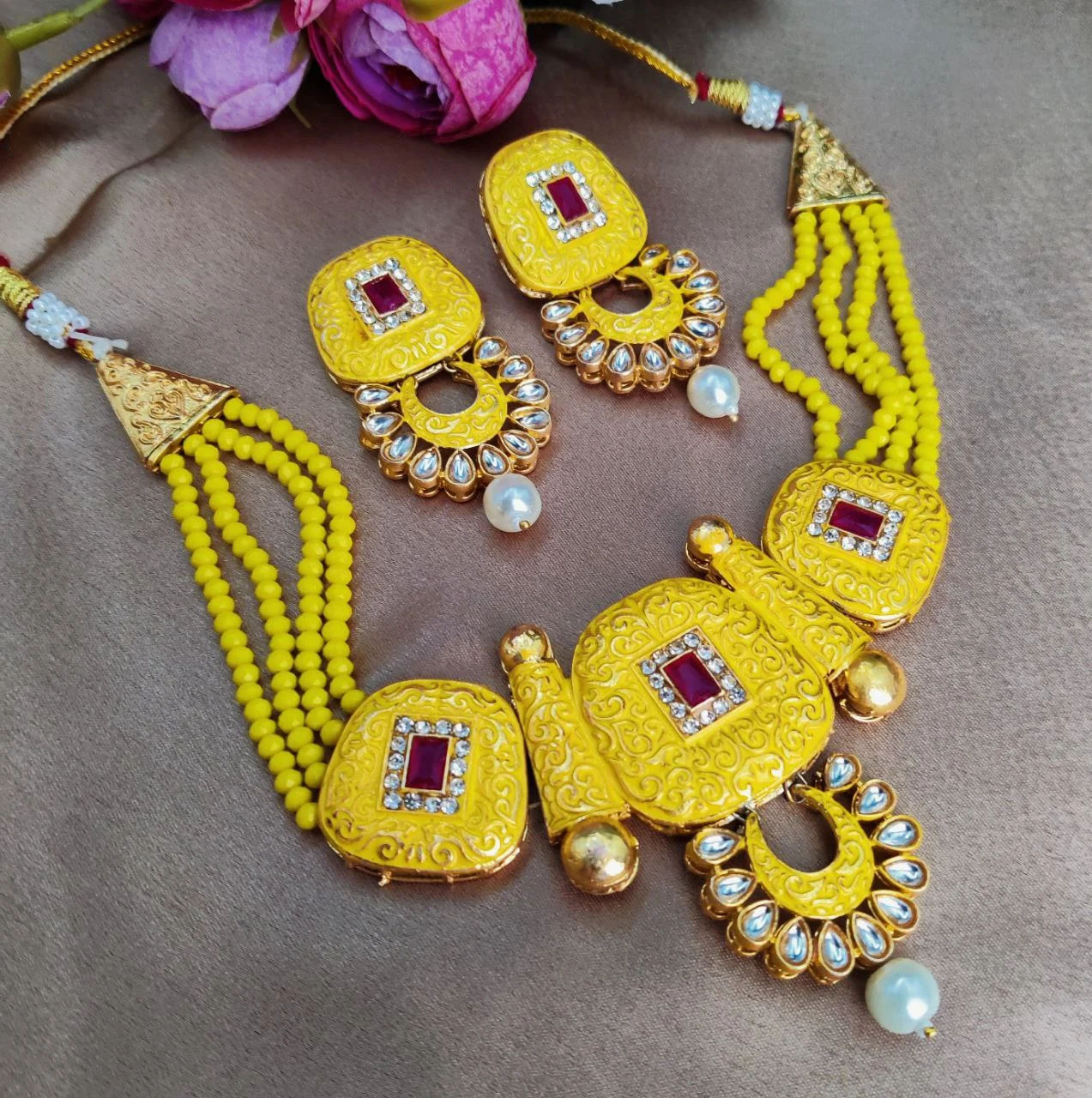 Yellow Indian Pakistani Women Oxidized Kundan Beaded Choker Meena Necklace Earring Set