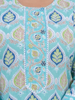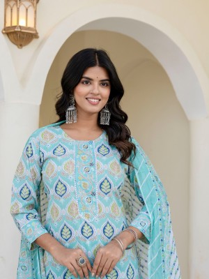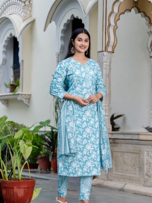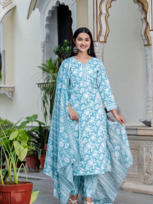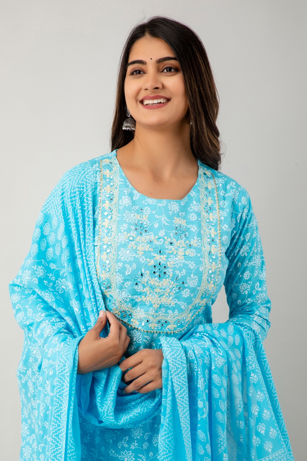 Sky Blue Floral Printed Indian Traditional Readymade Straight Salwar Kameez Kurti Pant Dupatta Set for Women - Set of 3