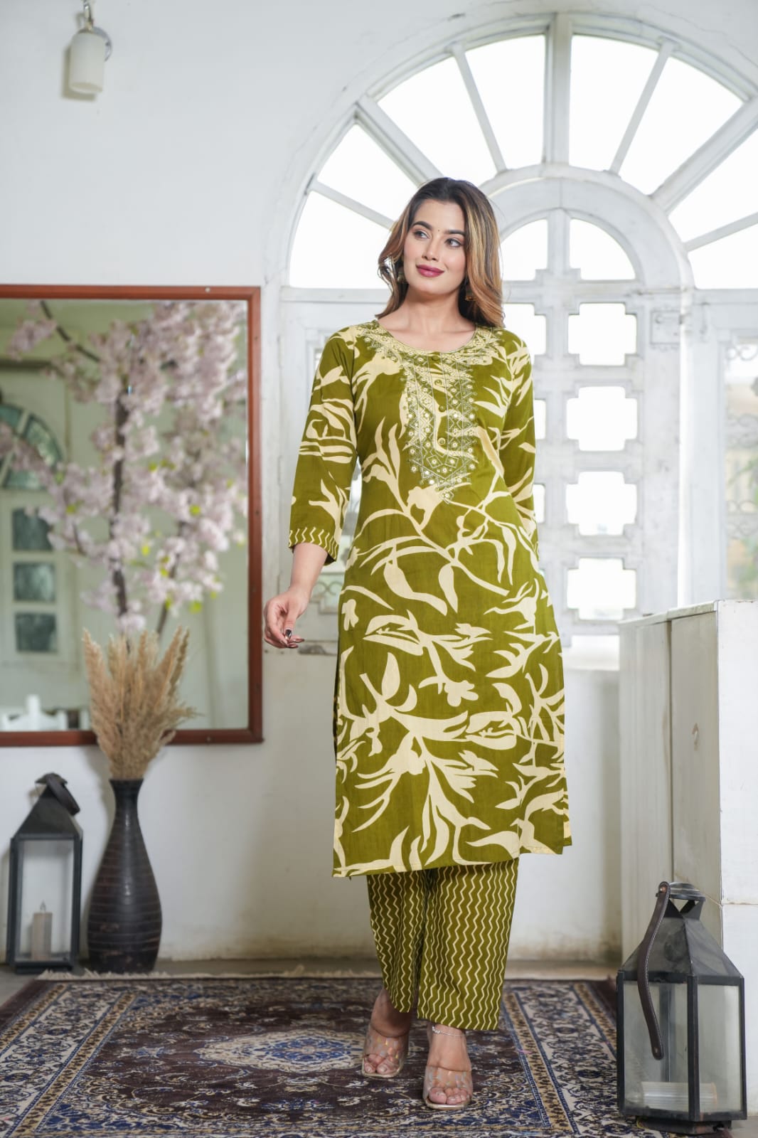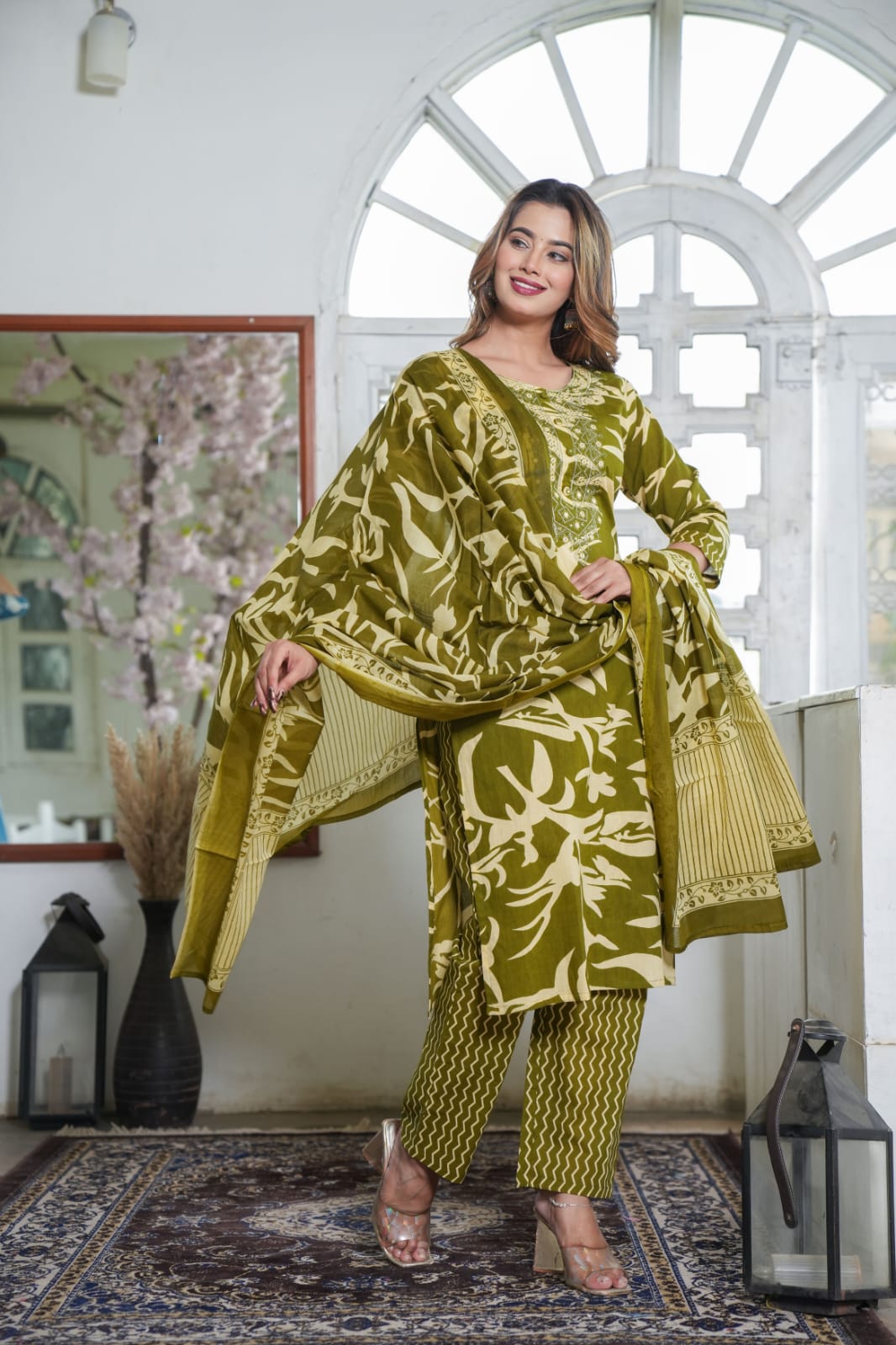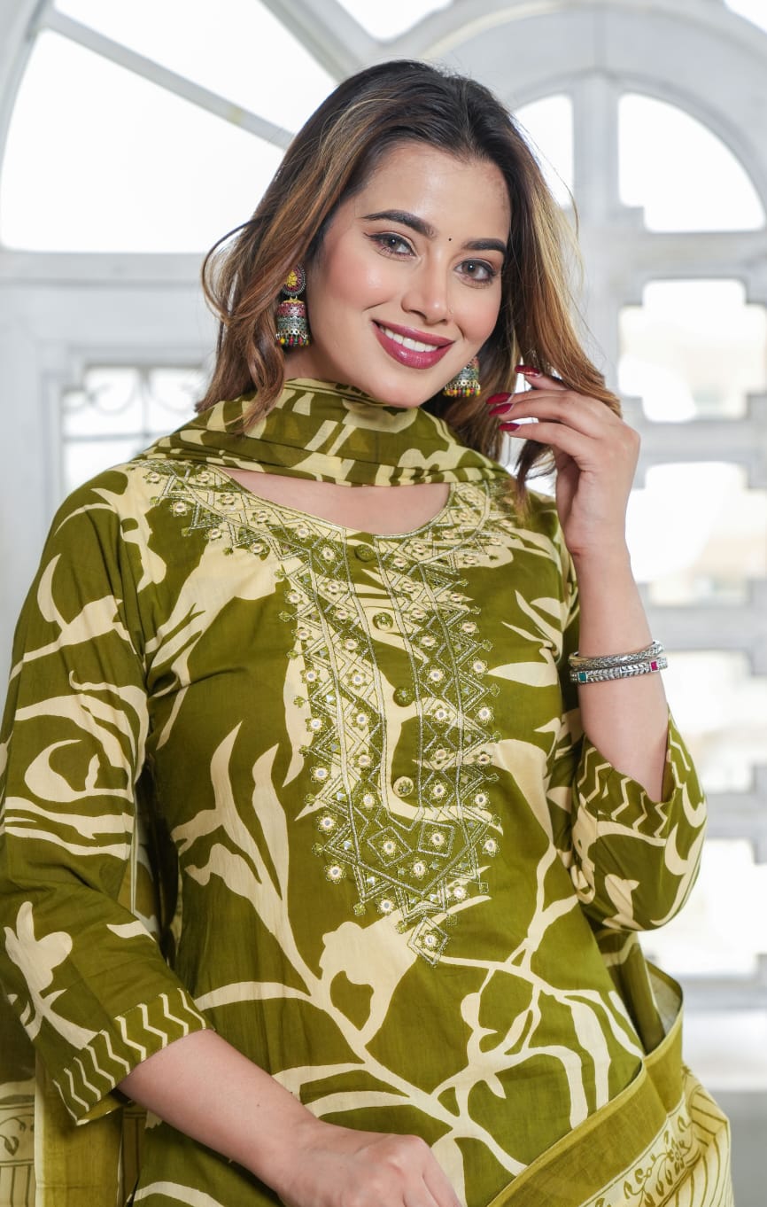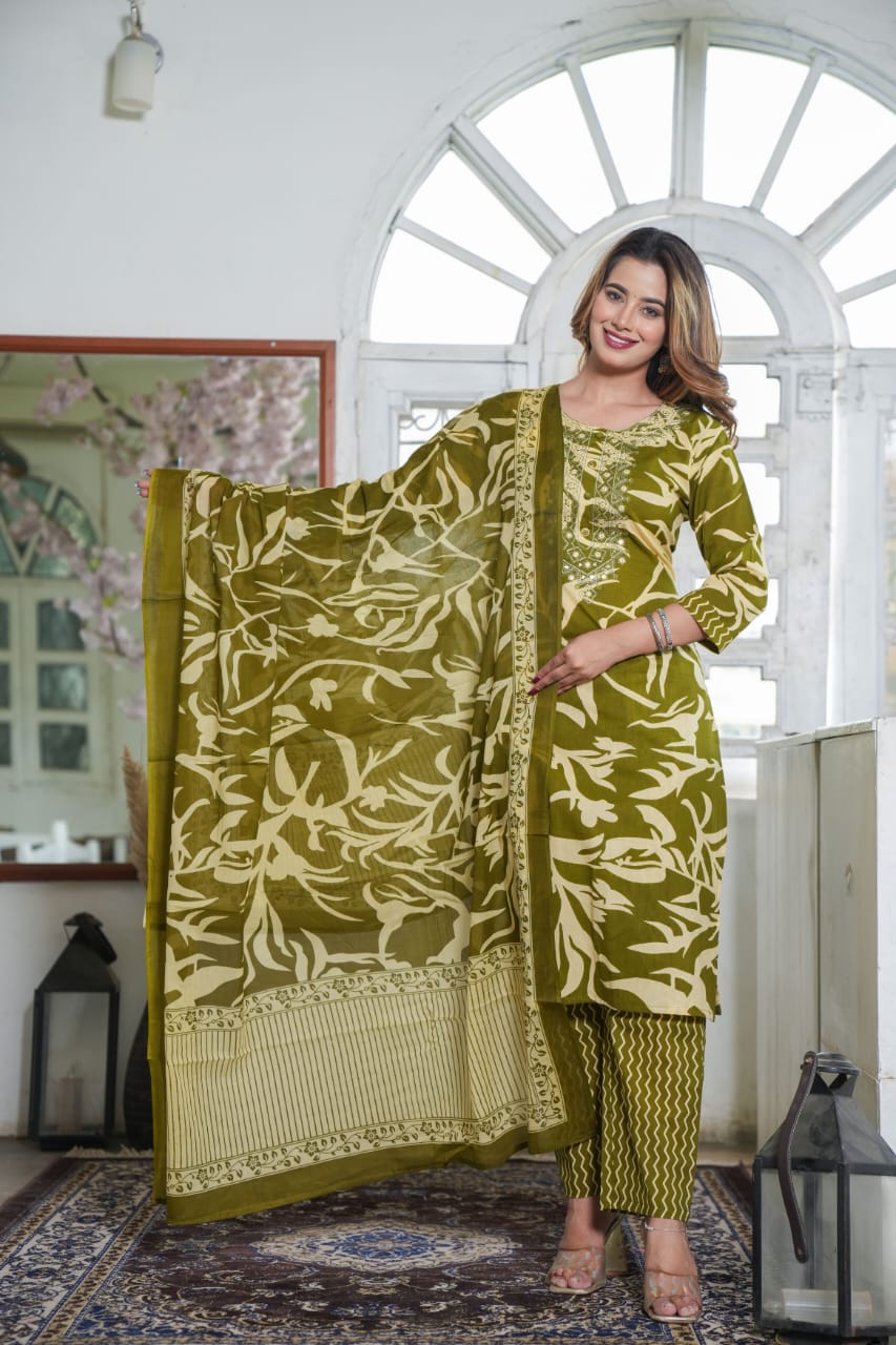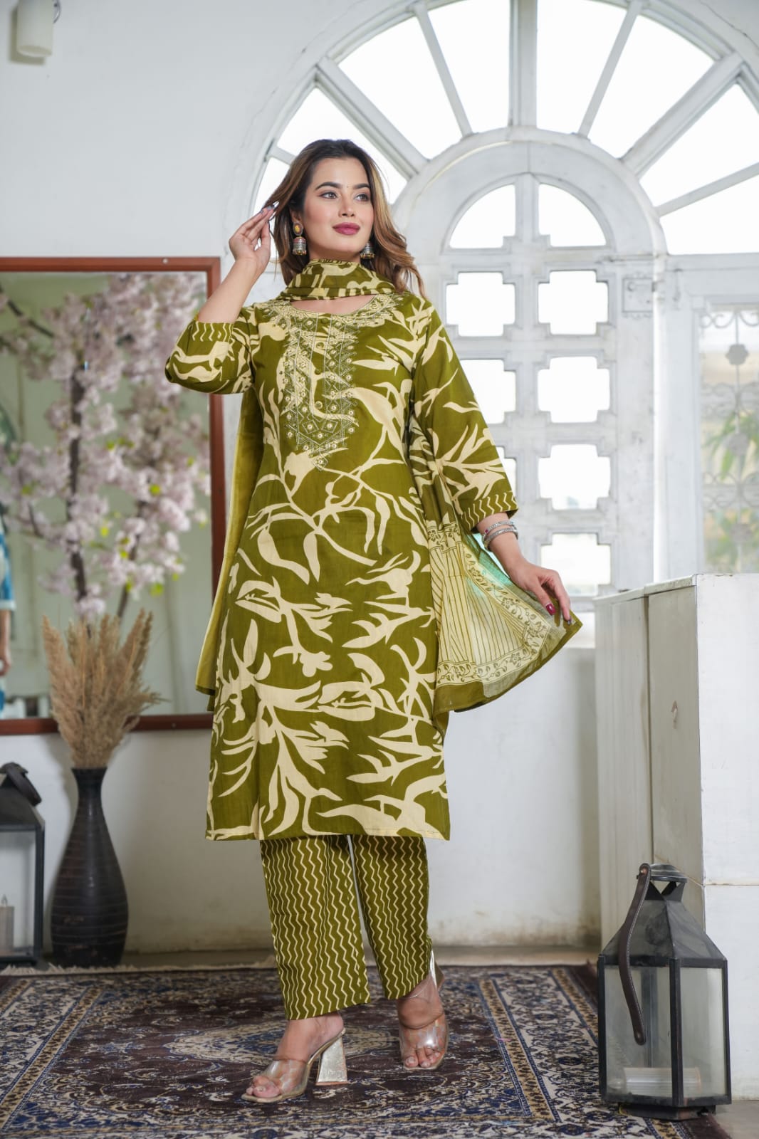 Green Printed Indian Traditional Readymade Straight Salwar Kameez Kurti Pant Dupatta Set for Women - Set of 3