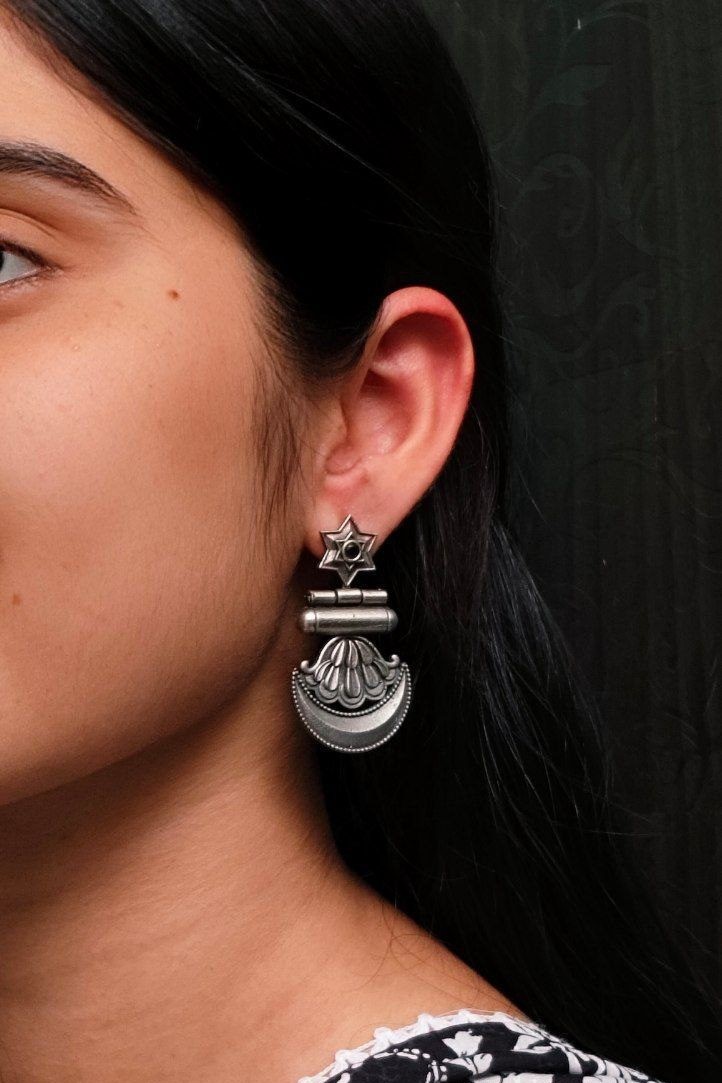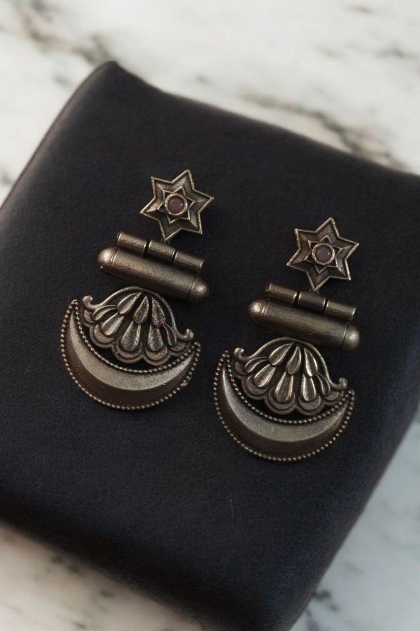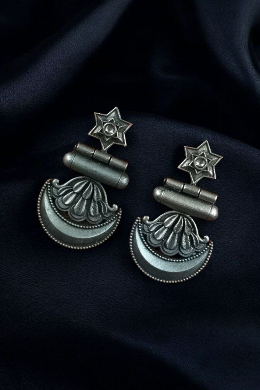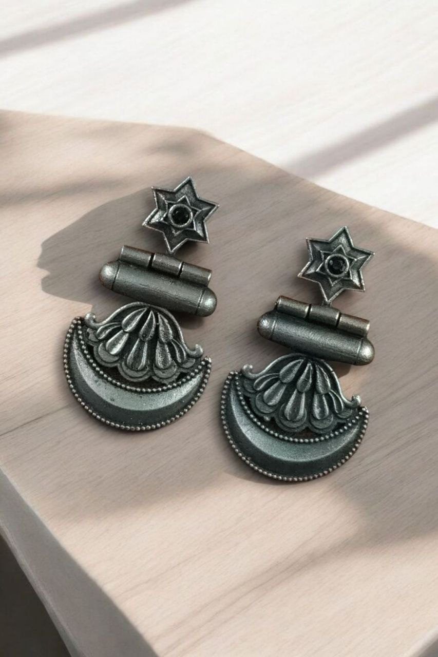 Mint Ethnic Star & Crescent Moon Designer Dangler Rustic Silver Oxidised Bohemian Earring Set for Girls