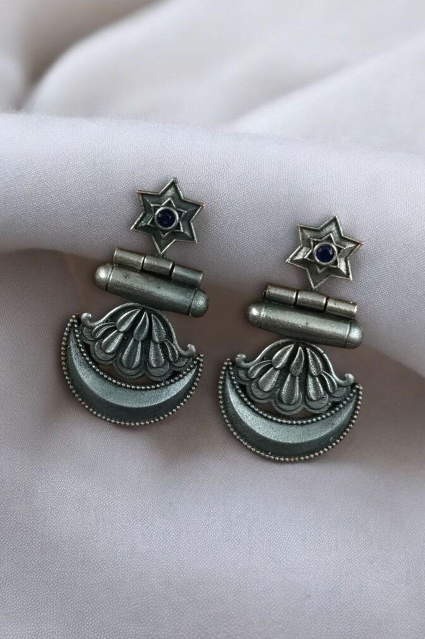Ethnic Star & Crescent Moon Designer Dangler Rustic Silver Oxidised Bohemian Earring Set for Girls