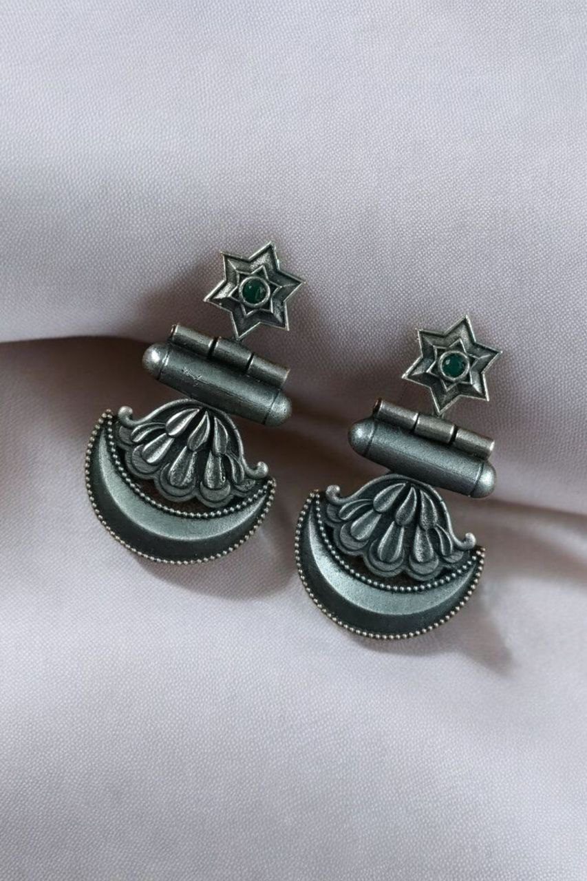 Green Ethnic Star & Crescent Moon Designer Dangler Rustic Silver Oxidised Bohemian Earring Set for Girls