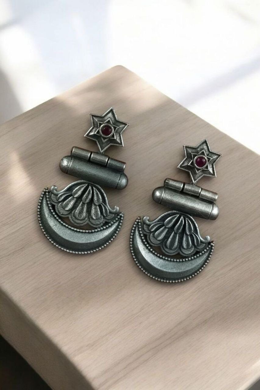 Red Ethnic Star & Crescent Moon Designer Dangler Rustic Silver Oxidised Bohemian Earring Set for Girls