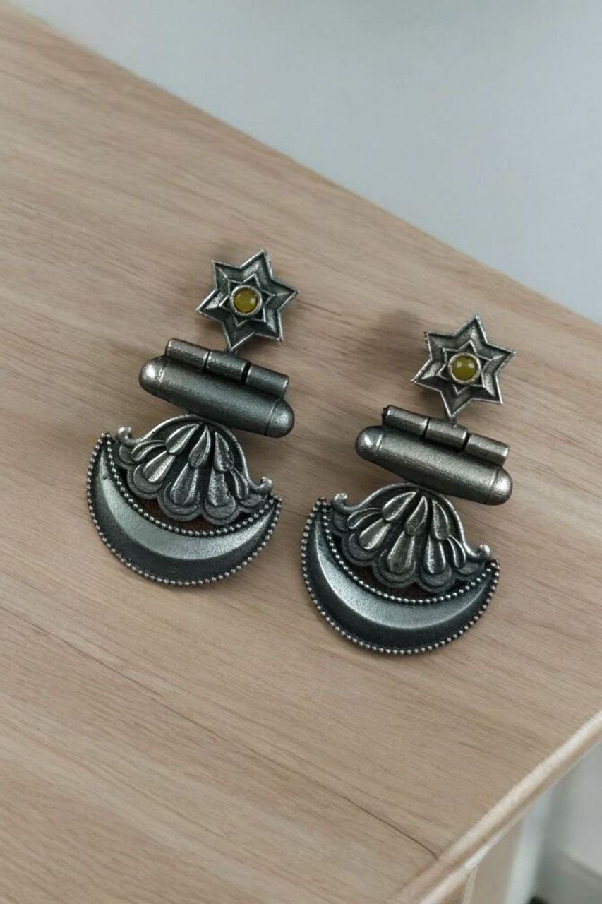 Yellow Ethnic Star & Crescent Moon Designer Dangler Rustic Silver Oxidised Bohemian Earring Set for Girls