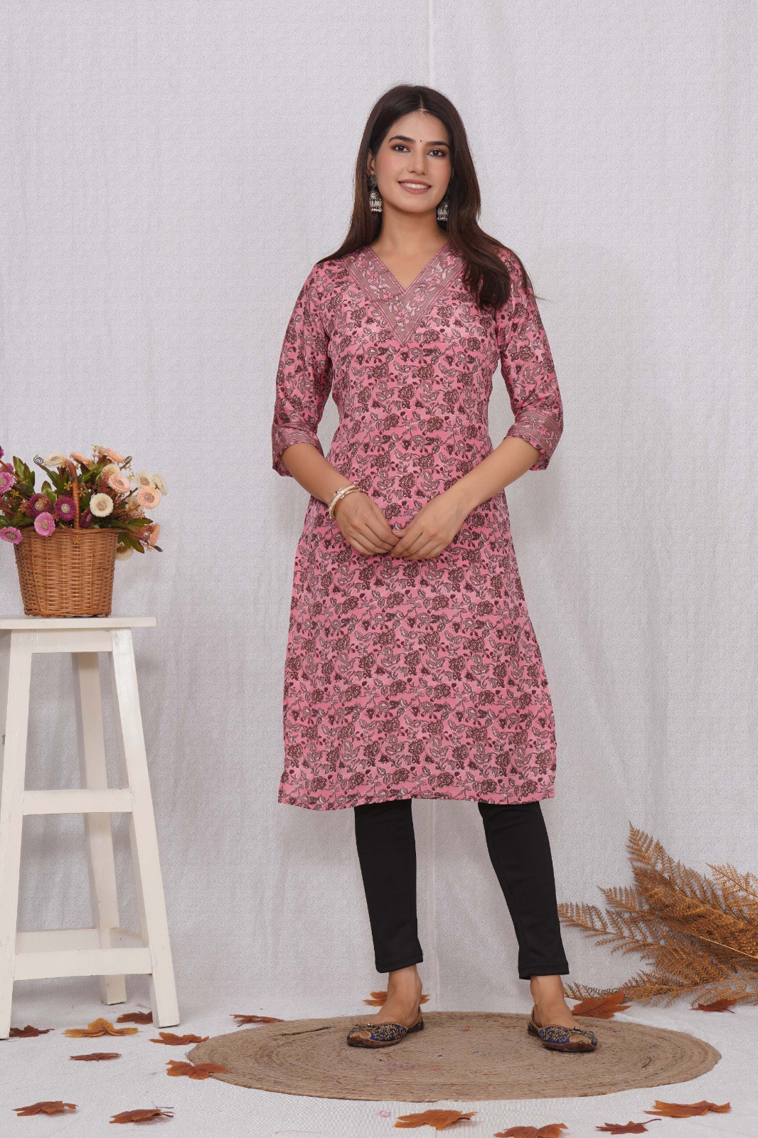Pink Floral Print Silk Straight Kurti with Lining Casual Tunic Top for Women (Kurti Only)