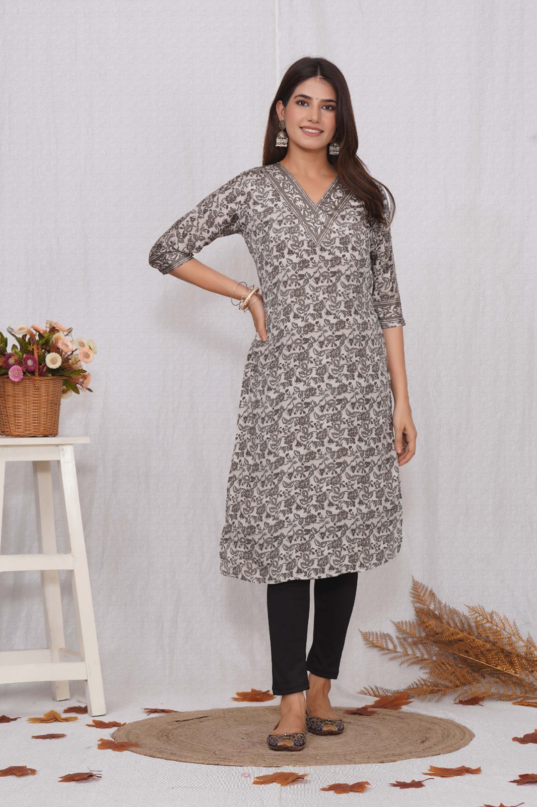 Elevate your everyday style with our Printed Kurti, a beautiful fusion of traditional artistry and modern comfort. Crafted from lightweight in Silk fabric, this kurti showcases an all-over floral block print in a refreshing shade-a striking example of India's rich textile heritage. The delicate motifs, created using natural, eco-friendly dyes, offer a soft yet captivating aesthetic. Sustainably made and kind to your skin, this kurti not only looks good but also aligns with conscious living. Thoughtfully designed for both comfort and versatility, it features flattering 3/4th sleeves and practical side pockets perfect for everything from casual outings to warm, sunny days. Whether you're dressing up or keeping it relaxed, this kurti effortlessly adapts to your mood and lifestyle.