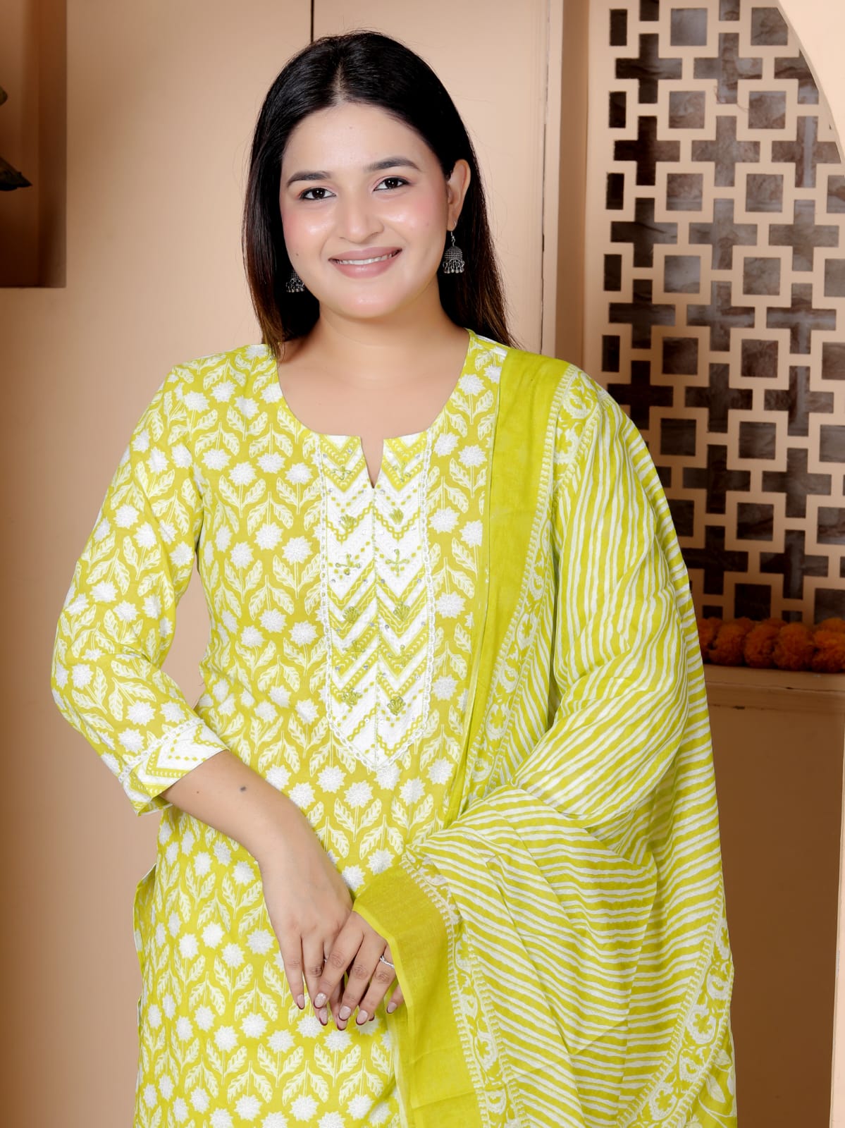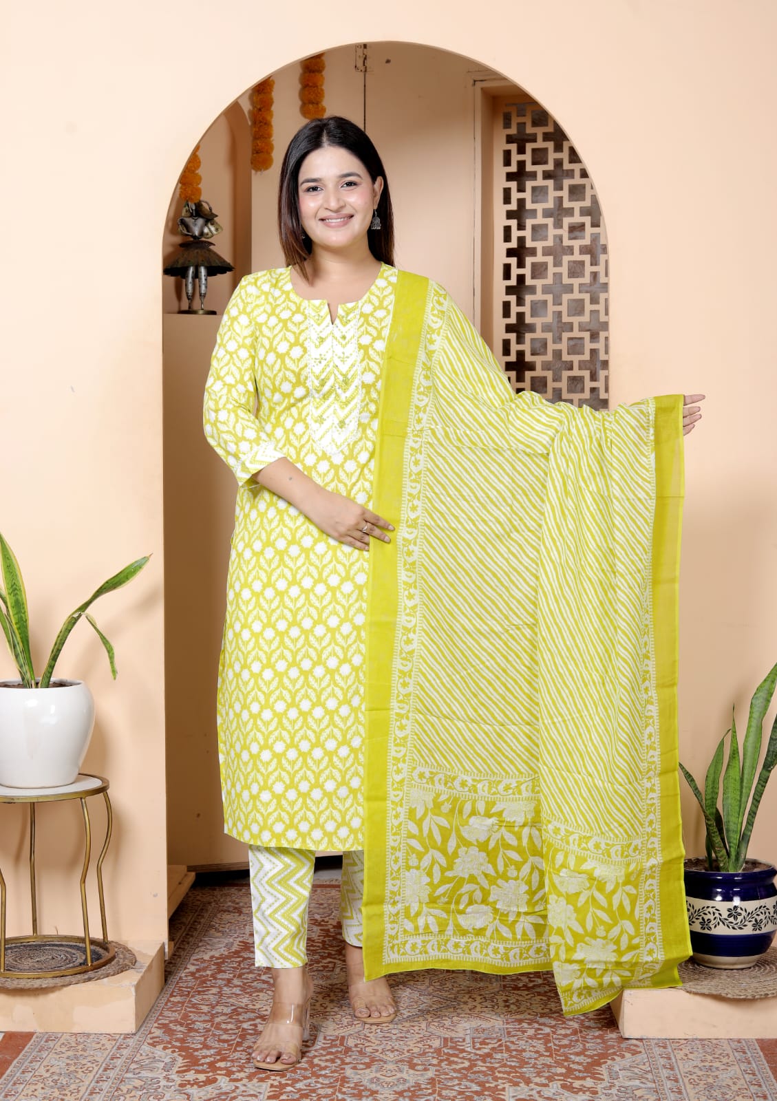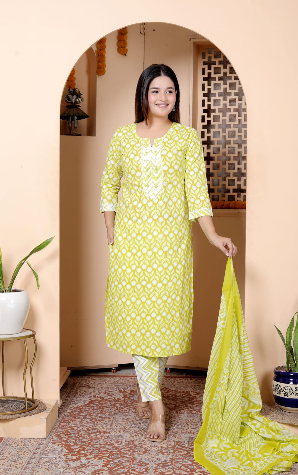 Yellow Floral Printed Indian Traditional Readymade Straight Salwar Kameez Kurti Pant Dupatta Set for Women - Set of 3